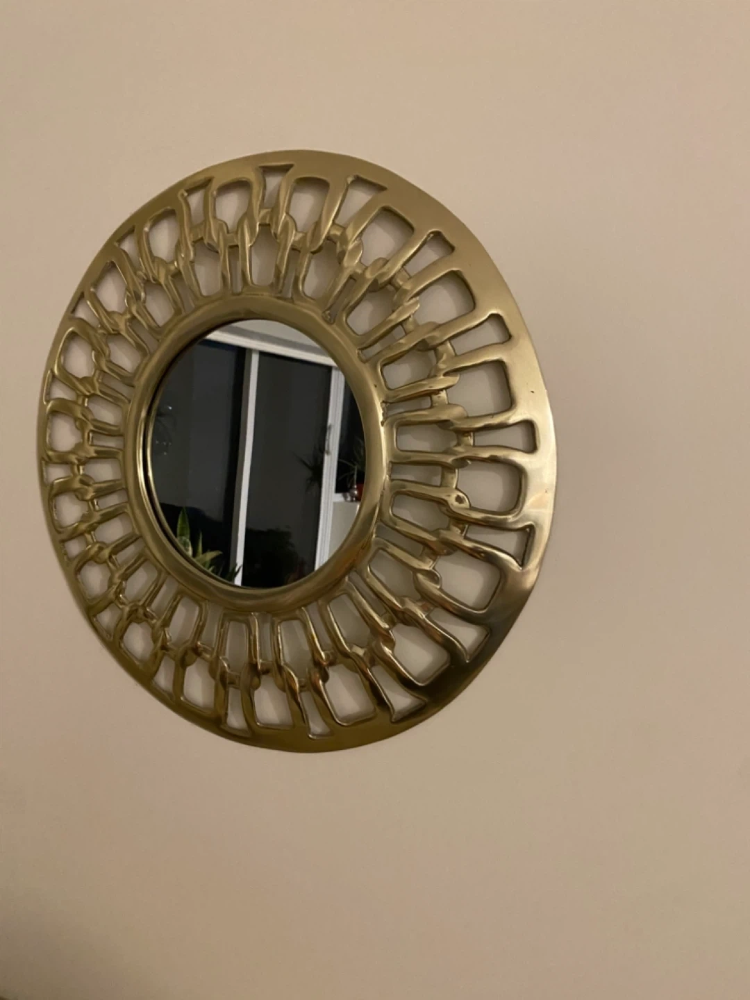 Round decorative mirror with a unique sunburst-style gold-tone metal frame. It's perfect for adding a touch of elegance to any room.