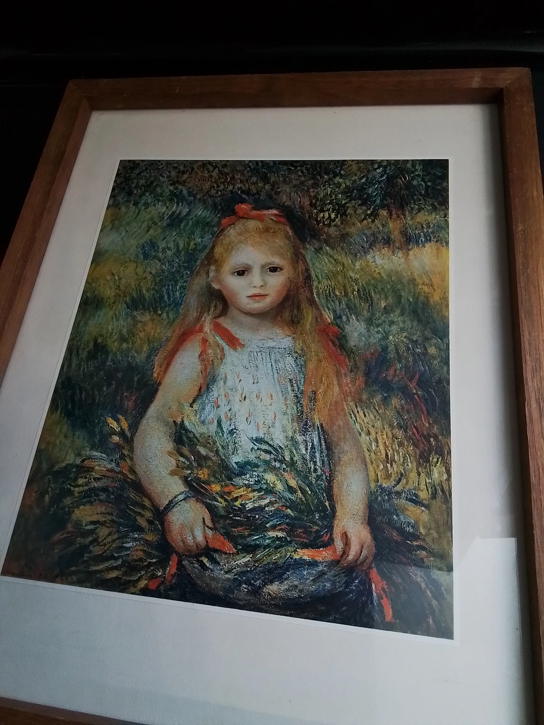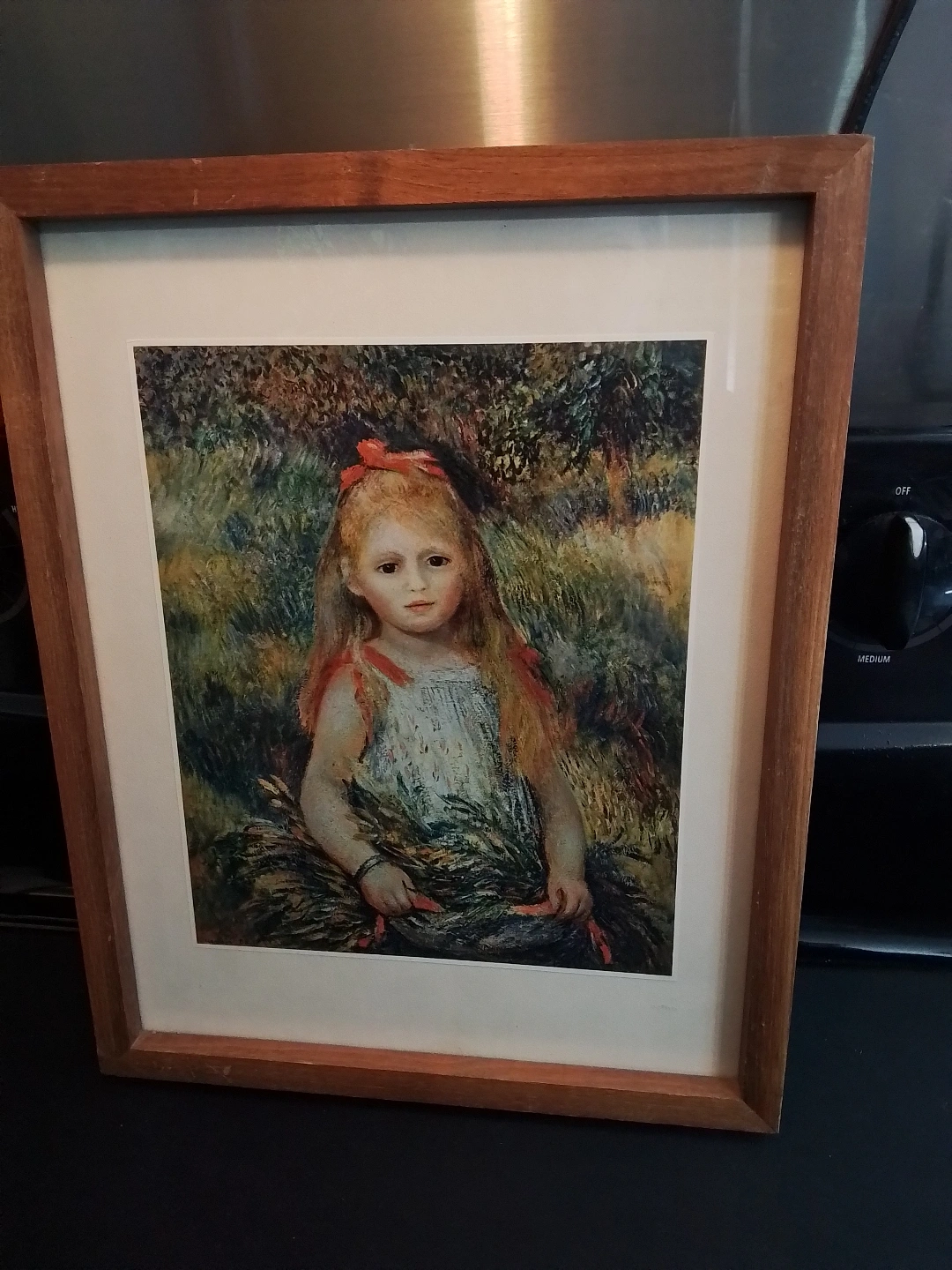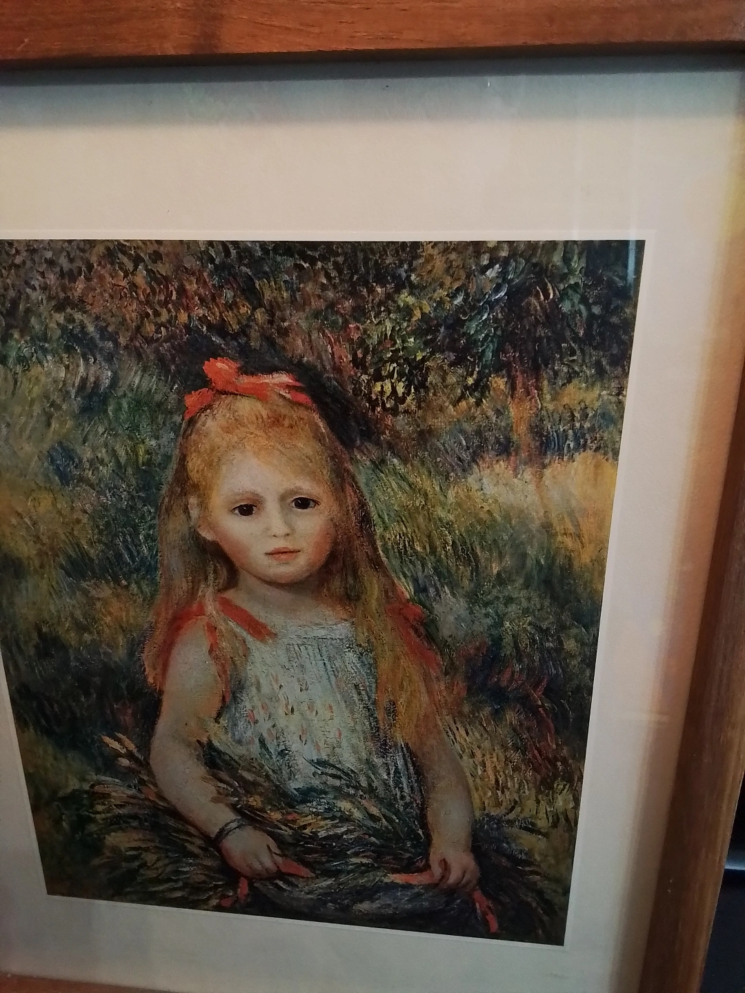 114French Litho on Paper by Pierre-Auguste Renoir '88 Lithograph on paper, framed. The artwork features a young girl in a white dress with orange accents, holding a bundle of greenery. The background is rendered in vibrant greens and yellows, suggesting an outdoor setting. "Renoir '88" printed on bottom left corner. 25 cm x 20 cm (10" x 8"), F: 39 cm x 30 cm (15 1/4" x 12") Estimate 150.00 - 300.00 USD Country of Origin: France This is a beautiful vintage French lithograph on paper by Pierre-Auguste Renoir, created in 1988. The piece is framed and showcases Renoir's signature impressionistic style. The condition is good, reflecting its age and history. Perfect for art lovers and collectors! I think you'll find that this lithograph adds a touch of class to any room. If the ad is still up, it's still available for purchase! Beautiful framed print of Pierre-Auguste Renoir's painting. Depicts a young girl holding wheat. Wooden frame. Ready to hang. Pickup at Young Street and Steels Ave