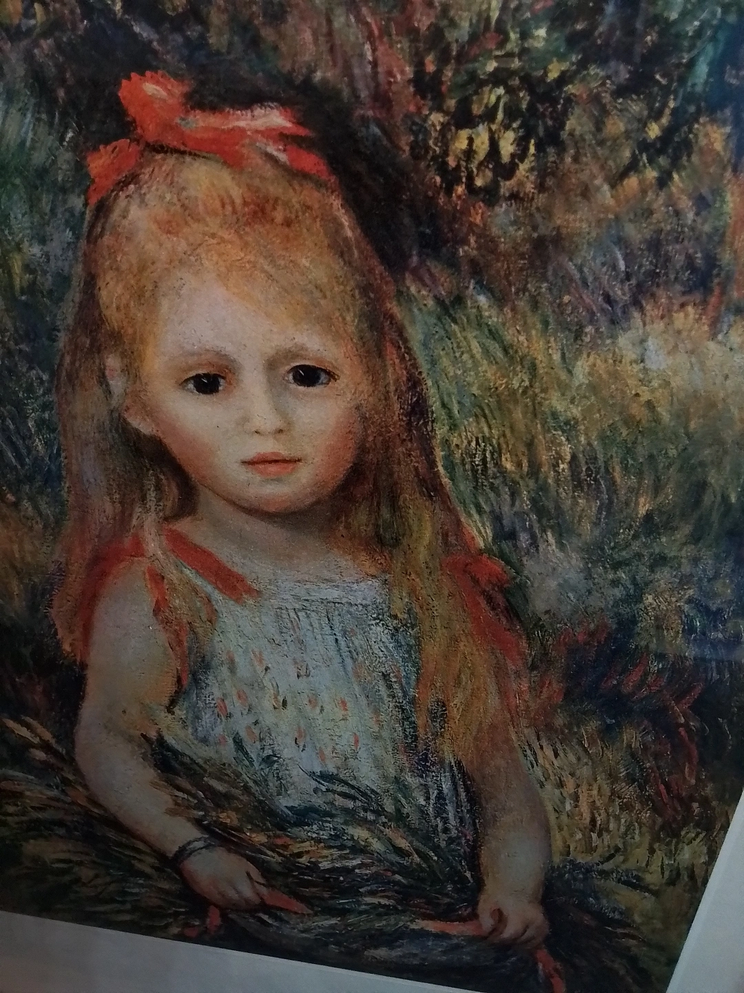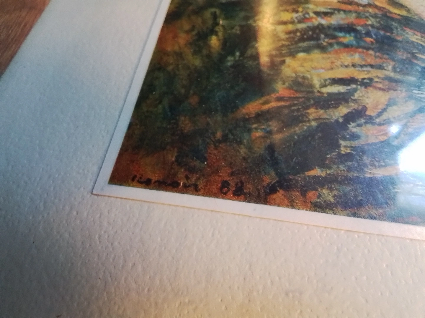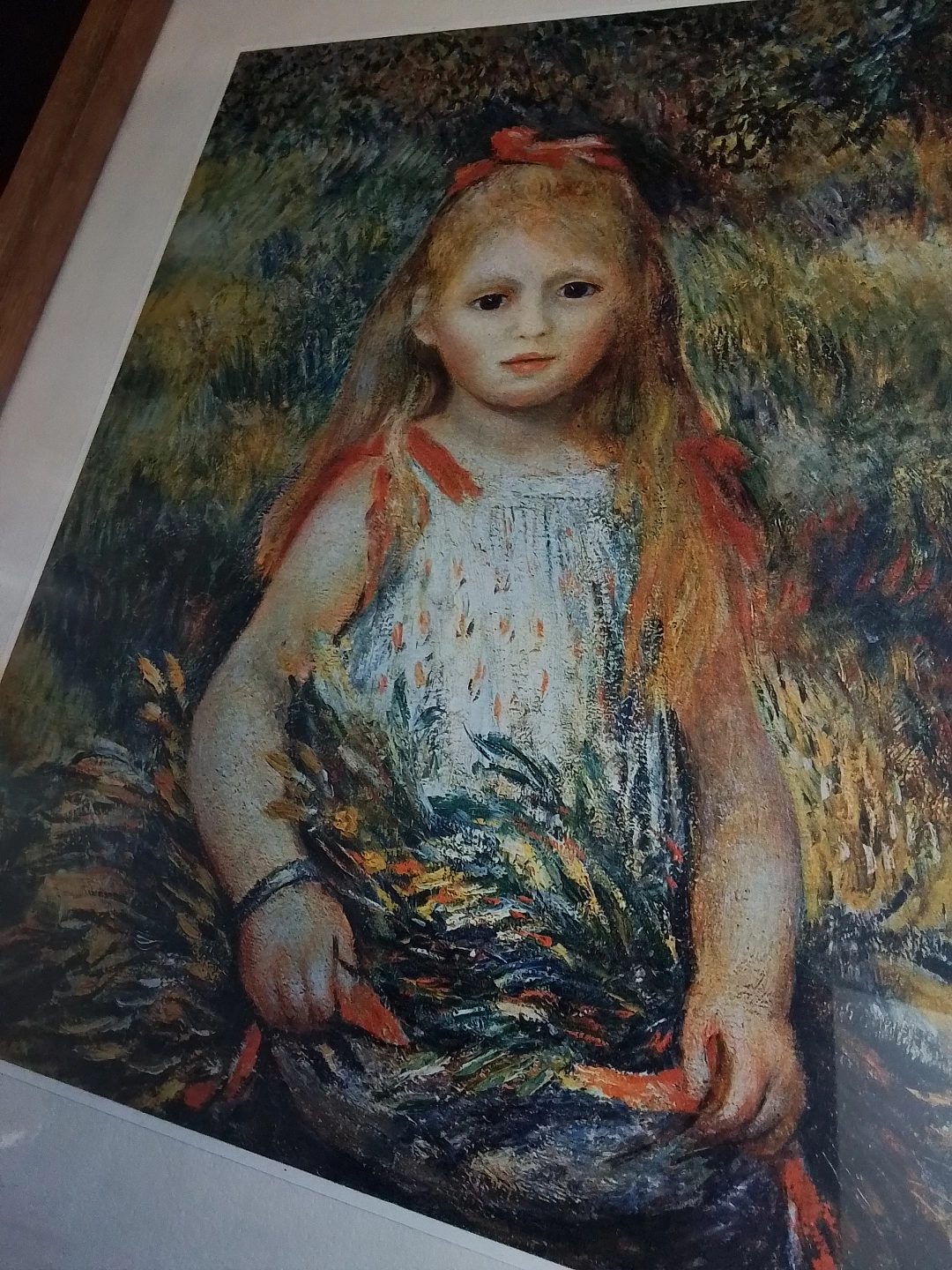 114French Litho on Paper by Pierre-Auguste Renoir '88 Lithograph on paper, framed. The artwork features a young girl in a white dress with orange accents, holding a bundle of greenery. The background is rendered in vibrant greens and yellows, suggesting an outdoor setting. "Renoir '88" printed on bottom left corner. 25 cm x 20 cm (10" x 8"), F: 39 cm x 30 cm (15 1/4" x 12") Estimate 150.00 - 300.00 USD Country of Origin: France This is a beautiful vintage French lithograph on paper by Pierre-Auguste Renoir, created in 1988. The piece is framed and showcases Renoir's signature impressionistic style. The condition is good, reflecting its age and history. Perfect for art lovers and collectors! I think you'll find that this lithograph adds a touch of class to any room. If the ad is still up, it's still available for purchase! Beautiful framed print of Pierre-Auguste Renoir's painting. Depicts a young girl holding wheat. Wooden frame. Ready to hang. Pickup at Young Street and Steels Ave
