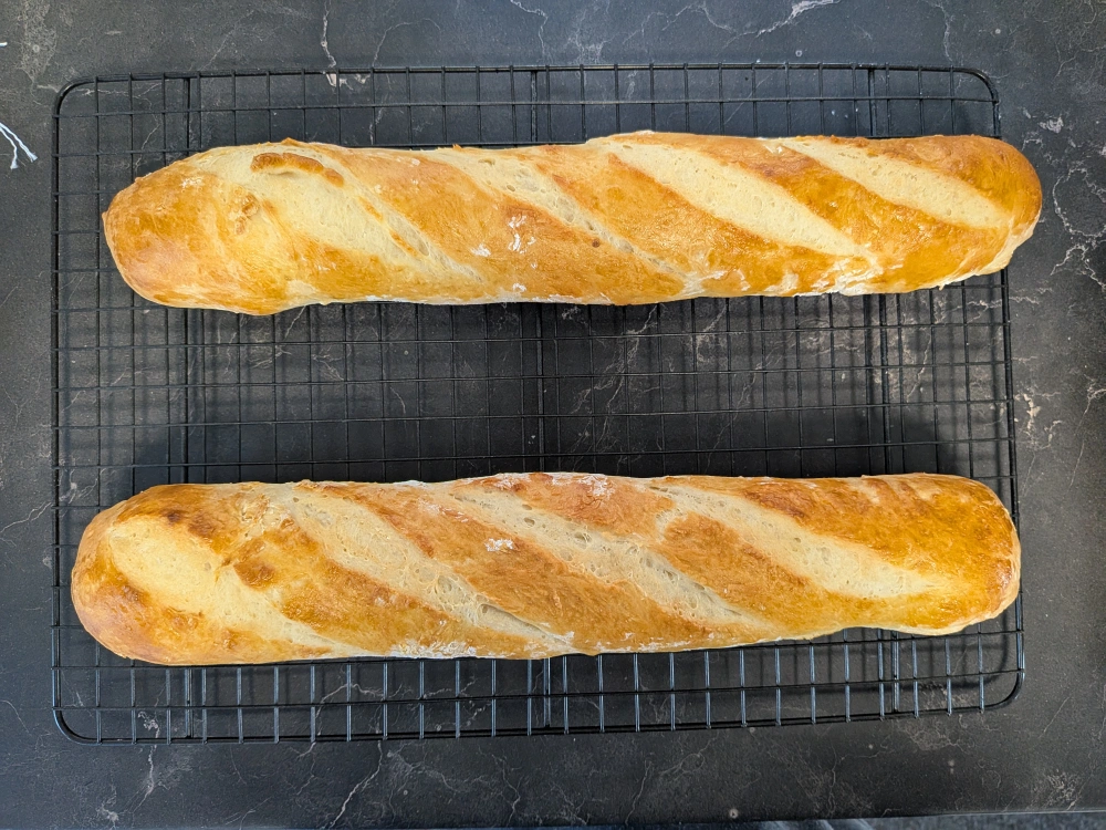 18Two freshly baked baguettes ready for your enjoyment! Perfect for sandwiches, soups, or just enjoying with some butter. They're golden brown and delicious! Plain or Everything Bagel $6 each or 2 for $10