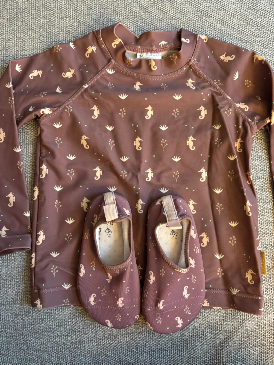 A cute set for your little one! Includes a FRESK swim top and matching swim shoes. Suitable for swimming pool and beach fun. Both feature a charming seahorse pattern in a lovely purple colour. The top is size 1-2 years. The shoes are size 21/22.