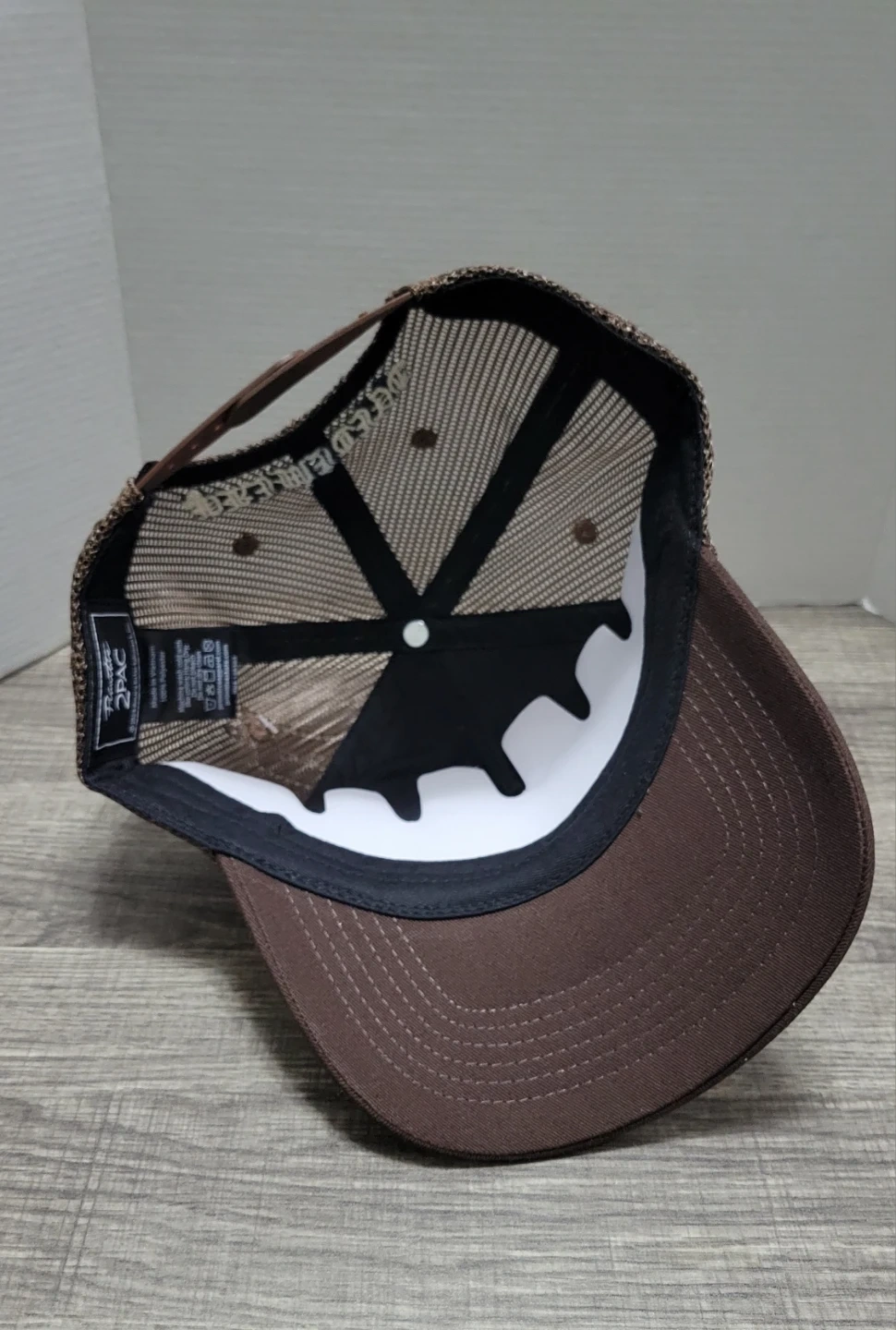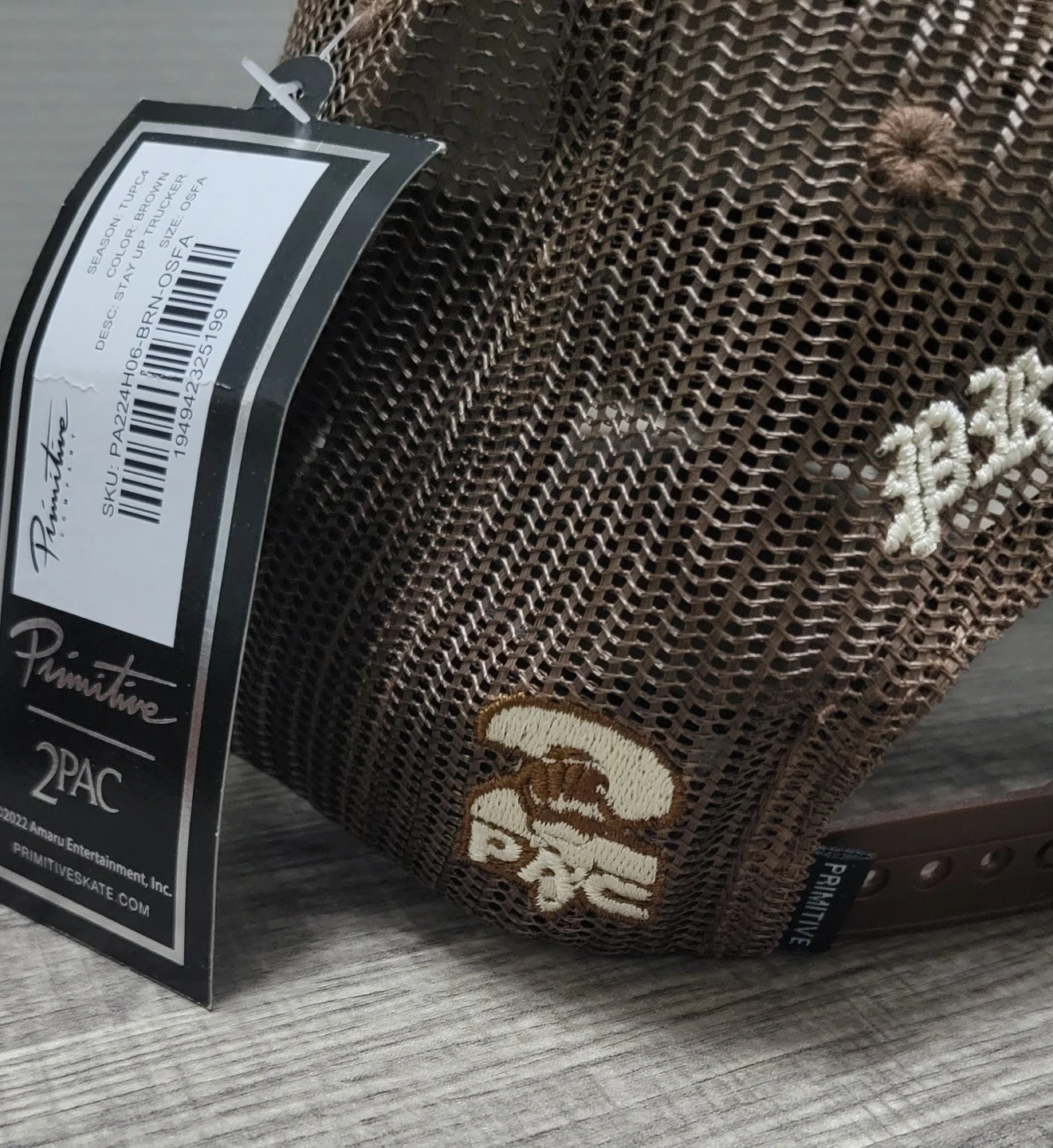 This is a Primitive brand trucker hat featuring a graphic of 2PAC. It's brown with a white front panel and mesh back. Made from 100% polyester.