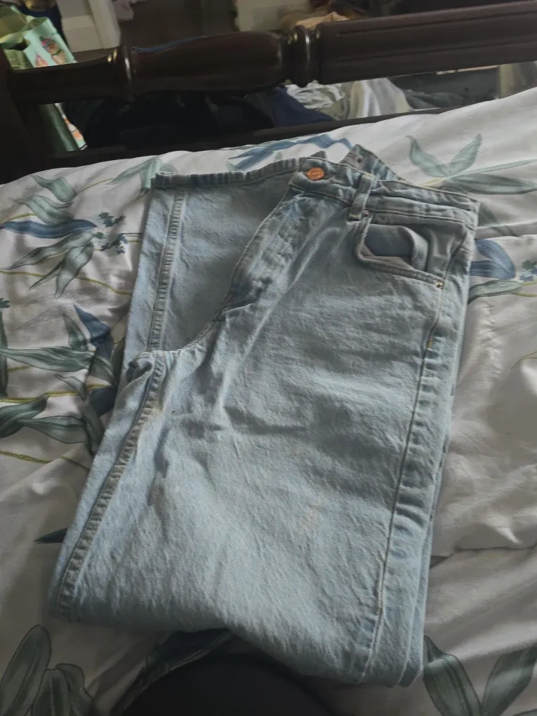 These are light wash denim jeans. Made with 100% cotton for comfort. They're suitable for casual wear any day of the week!