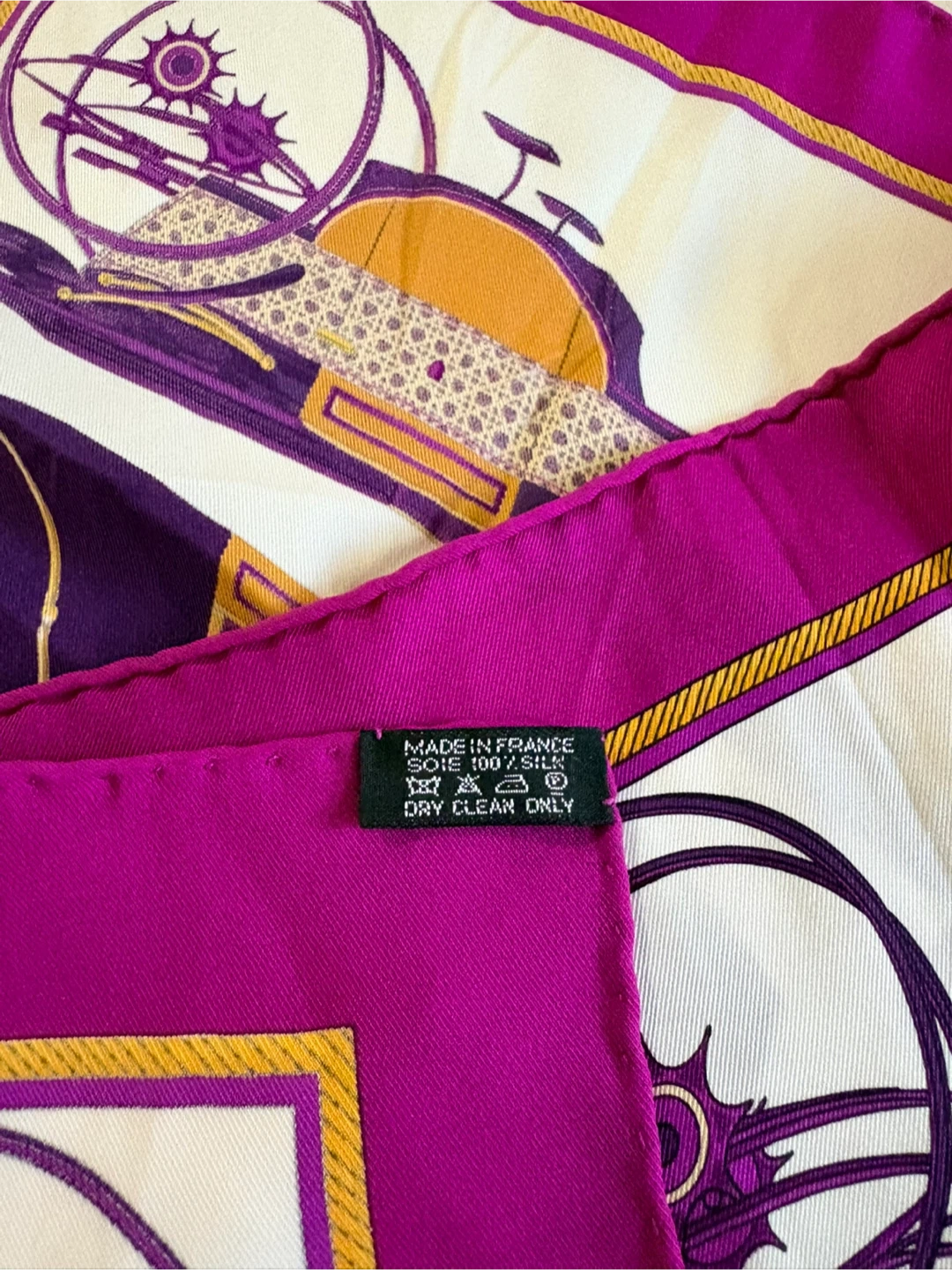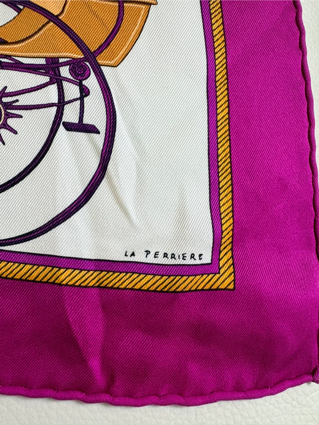 This is a beautiful Hermès silk scarf Les Voitures A Transformation featuring the 'La Perriere' design