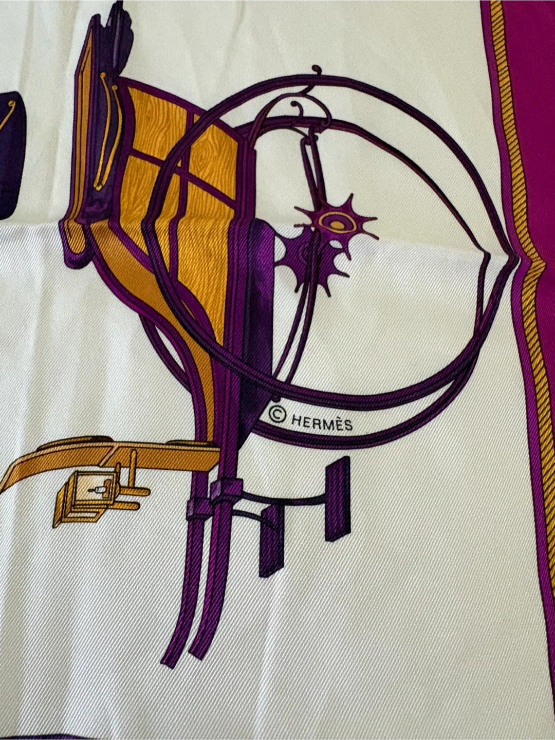 This is a beautiful Hermès silk scarf Les Voitures A Transformation featuring the 'La Perriere' design