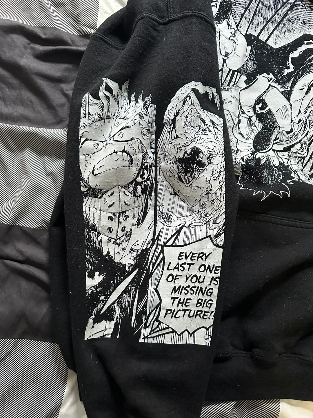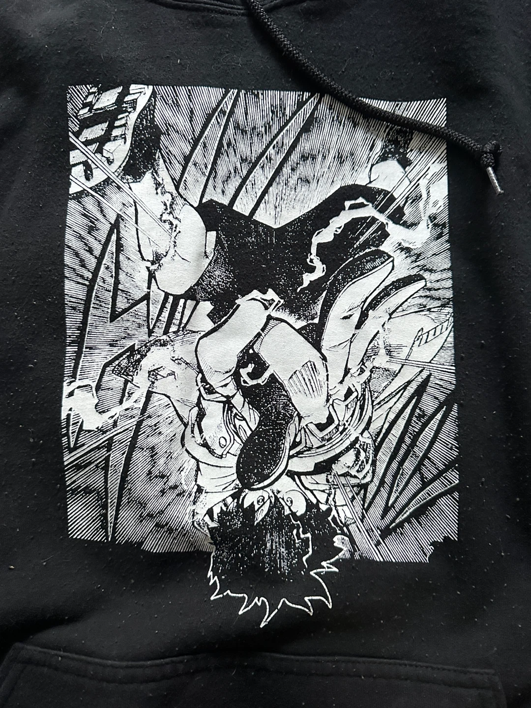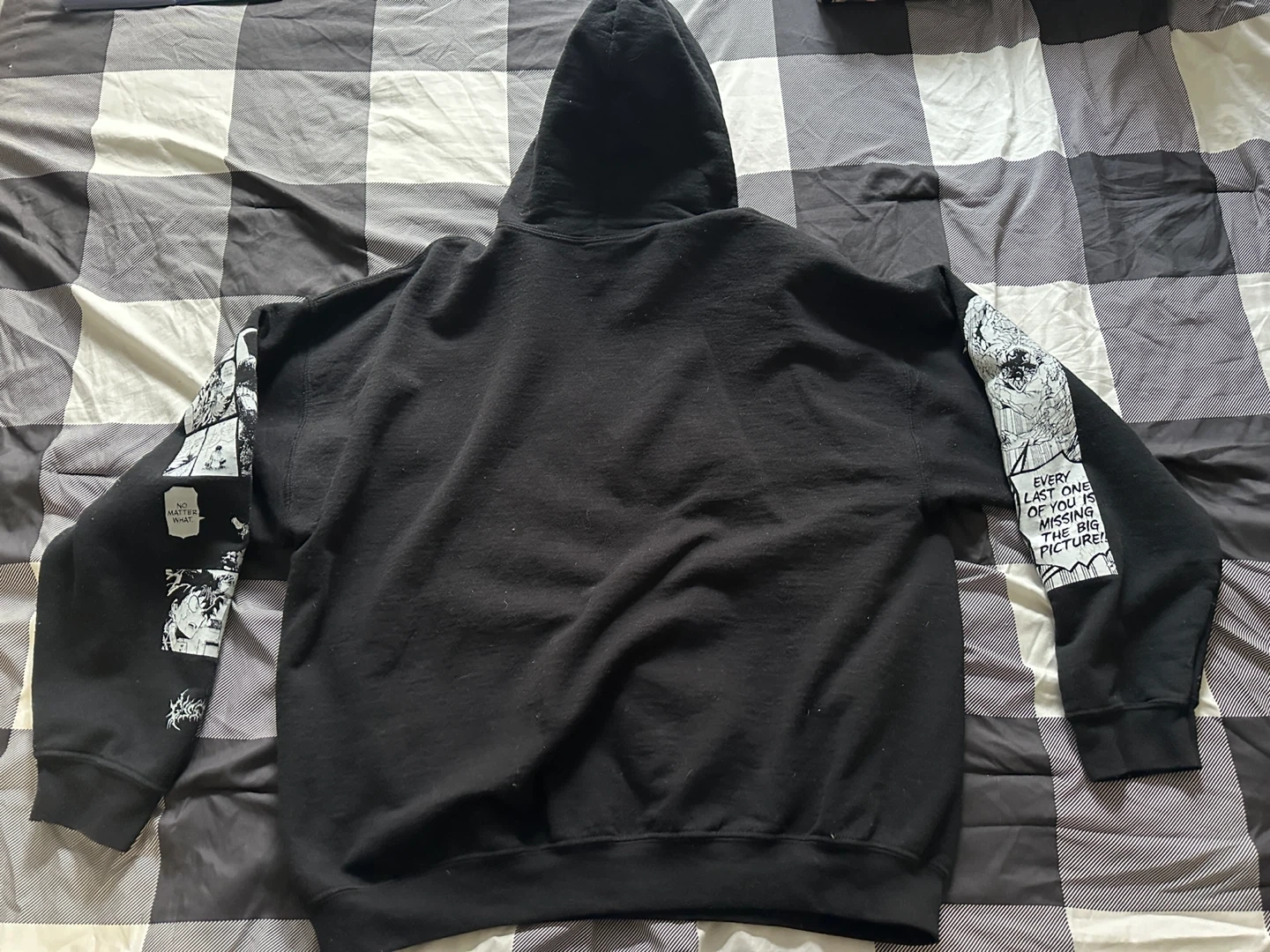 This black hoodie features manga-style graphics on the front and sleeves. It's made of a 50% cotton and 50% polyester blend. Size XL.
