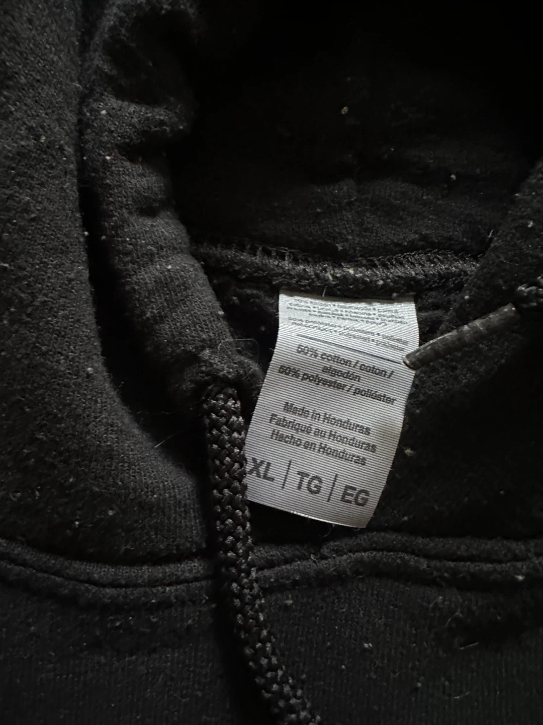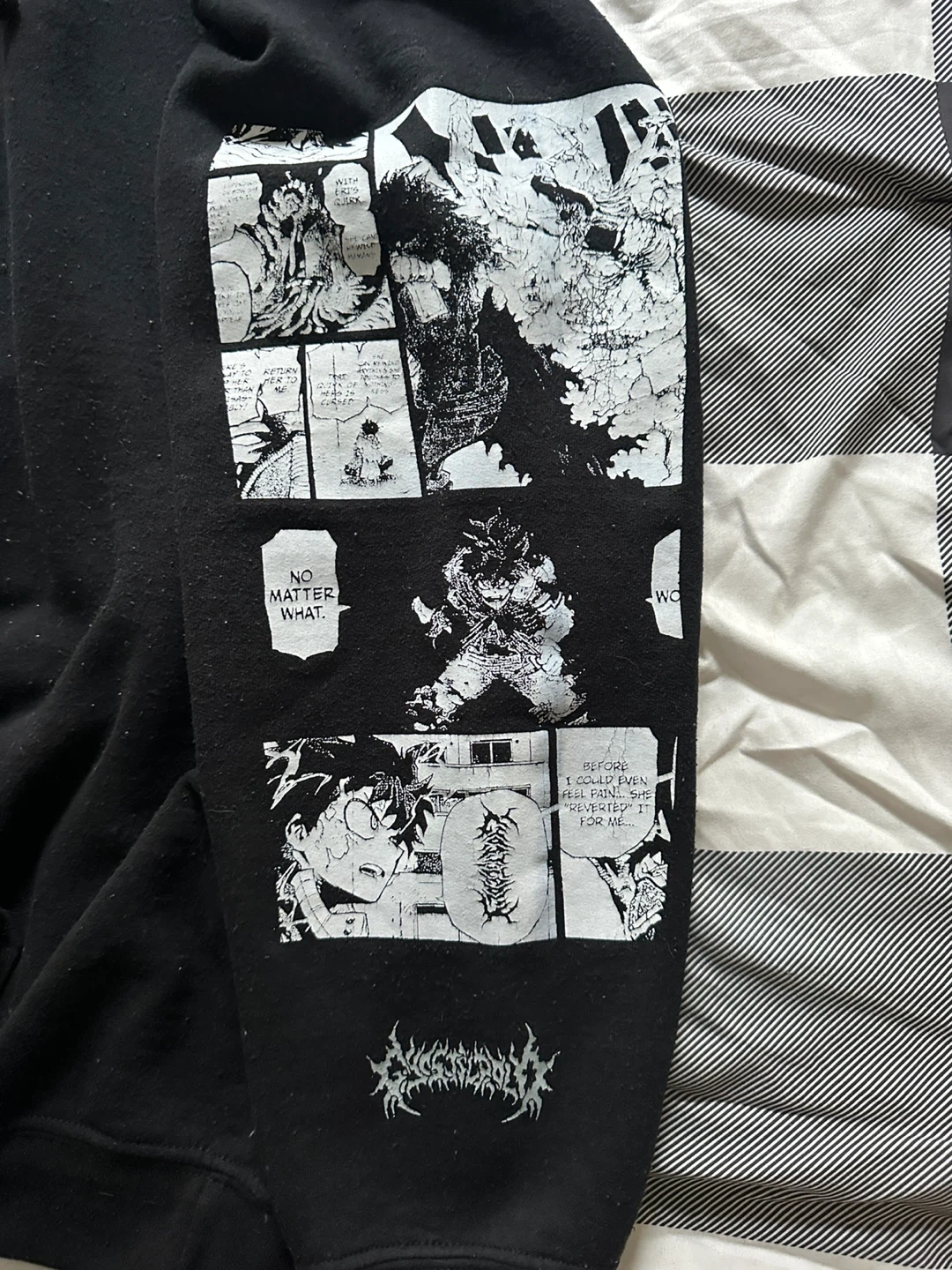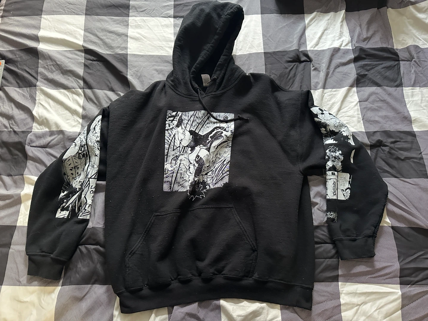 This black hoodie features manga-style graphics on the front and sleeves. It's made of a 50% cotton and 50% polyester blend. Size XL.
