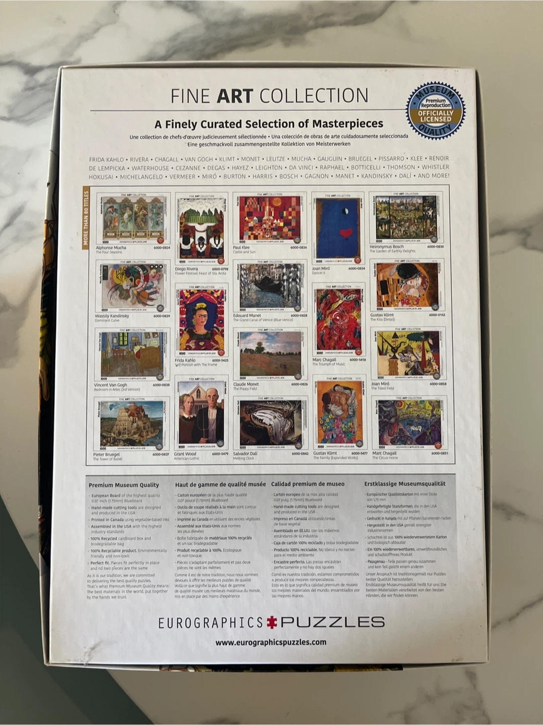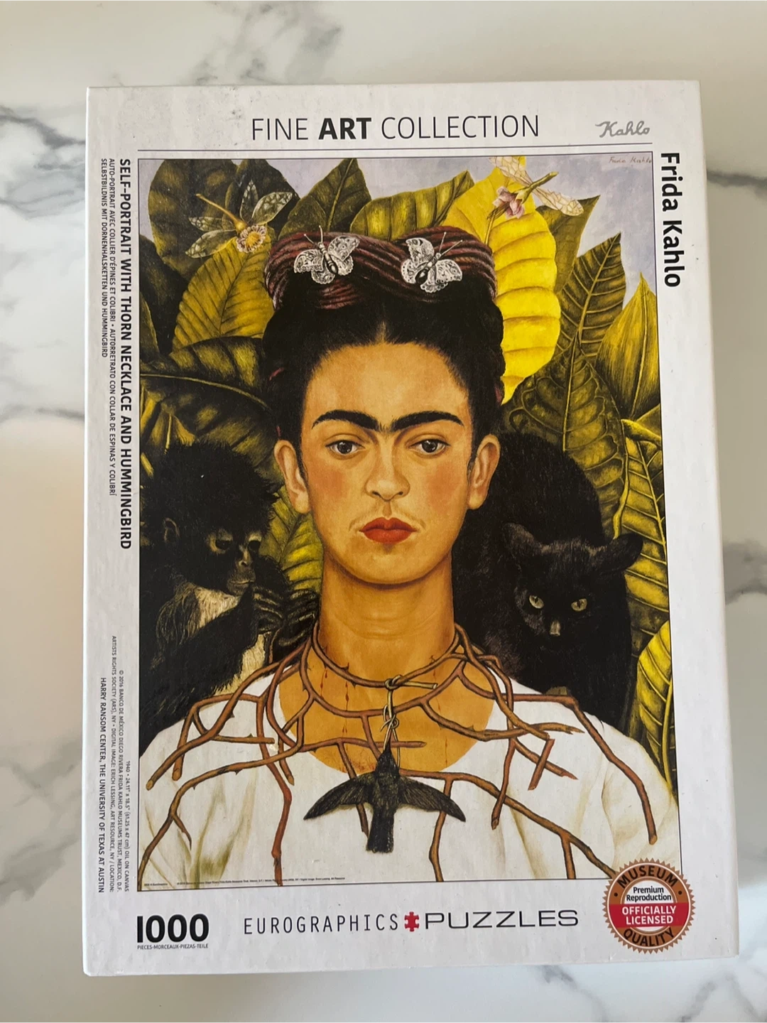 Selling a Eurographics 1000-piece puzzle featuring Frida Kahlo's "Self-Portrait with Thorn Necklace and Hummingbird"! It's from the Fine Art Collection and is officially licensed. The puzzle pieces are all there and ready for a new home. Great for art lovers and puzzle enthusiasts alike
