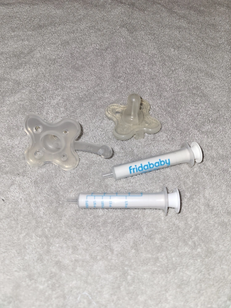 2 set of the Frida Baby Accudose pacifier med Dispenser. It's a clever way to give your little one medicine without the fuss. Perfect for babies and toddlers! Liquid is distributed at the side of the month into the cheek, so it doesnt go right to the throat. pacifier provides a familiar comfort, and can be closed once Medicine is dospensed. used these for Ovol, Gripe water, and Acetaminophen. super helpful! Pickup preferred at border of bridgeland and crescent heights. Cash or e transfer accepted. If delivery needed, feel free to ask and we can discuss details to see if it works.
