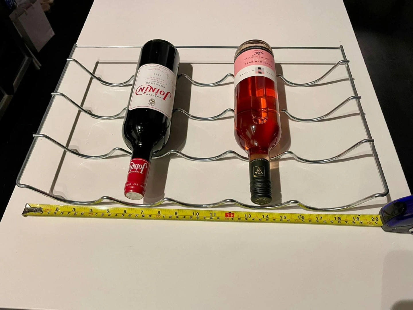 29Chrome wine rack for your slim refrigerator. Holds 5 bottles. Measures 19.75 inches wide, 12 inches deep. Wine not included π