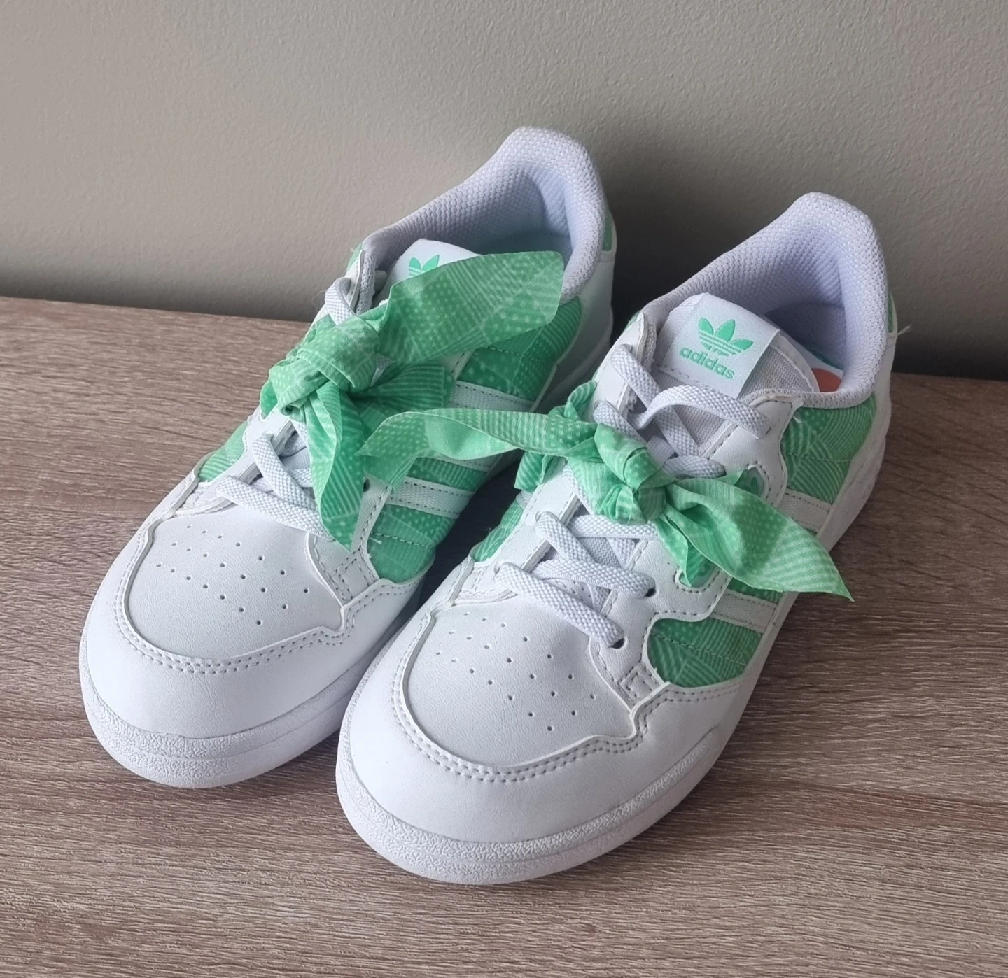 These Adidas Continental 80 shoes are a fresh white with green accents. They feature the classic Adidas branding and come with green patterned ribbon laces. Size US 2.5, UK 2, FR 34, JP 210, CHN 210.