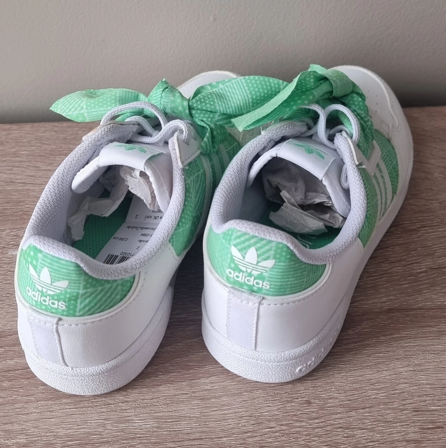 These Adidas Continental 80 shoes are a fresh white with green accents. They feature the classic Adidas branding and come with green patterned ribbon laces. Size US 2.5, UK 2, FR 34, JP 210, CHN 210.