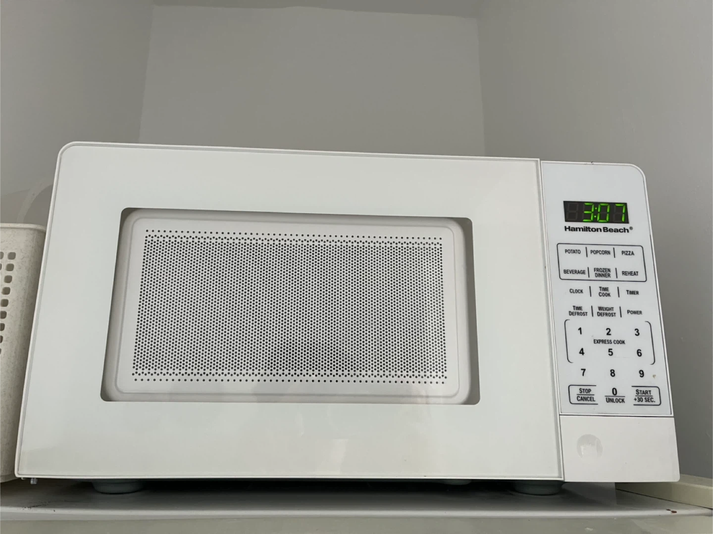 This is a Hamilton Beach microwave. It has a white exterior and a digital display. Preset buttons include potato, popcorn, pizza, beverage, frozen dinner, and reheat.