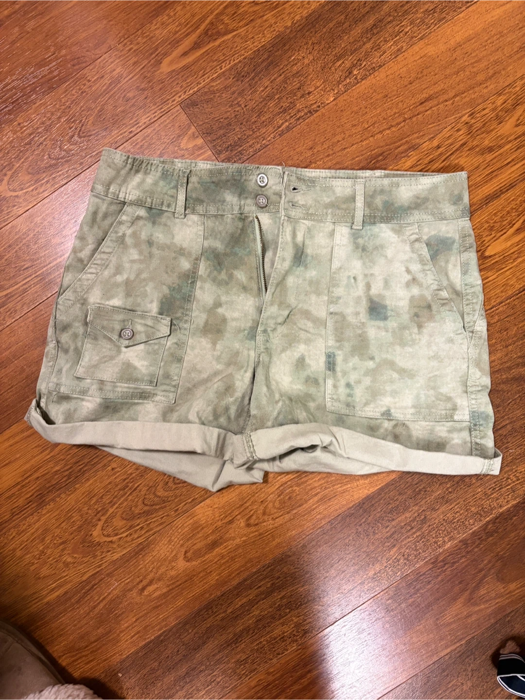 WHITES RD & STROUDS LANE Jordache cargo shorts size 8. They feature a green tie-dye pattern and utility pockets. excellent condition..