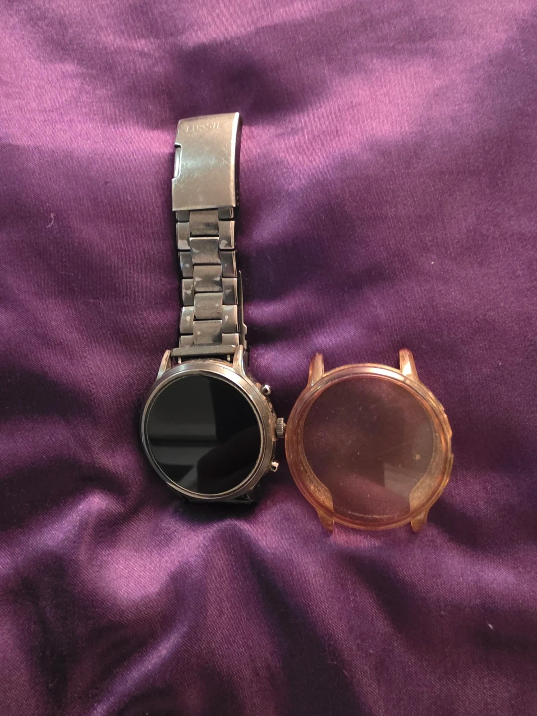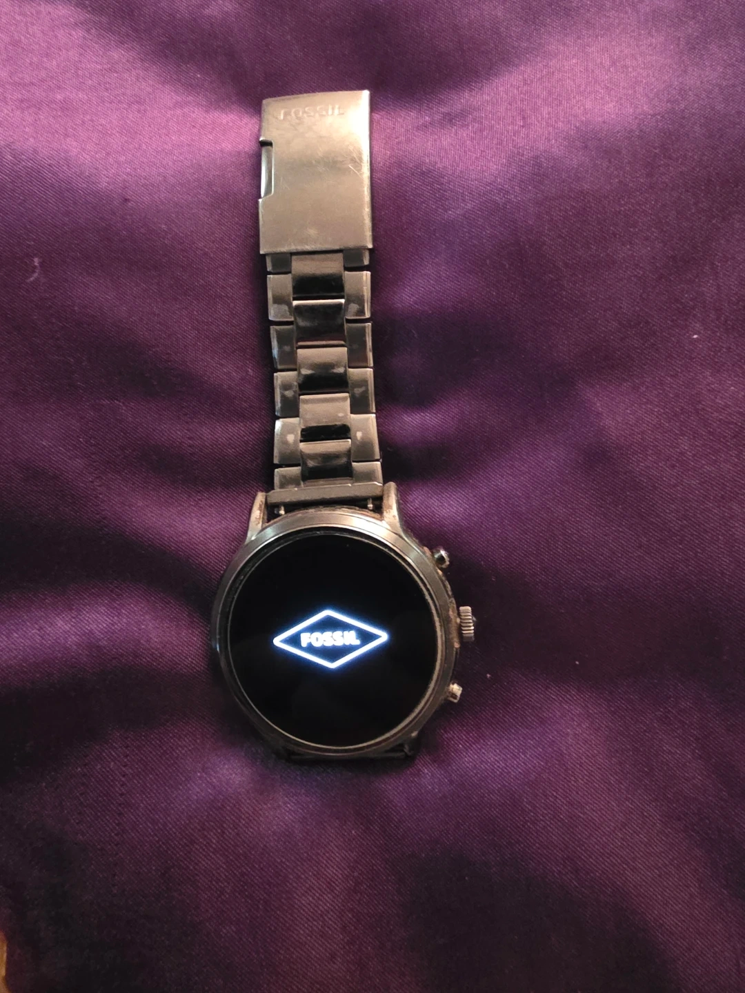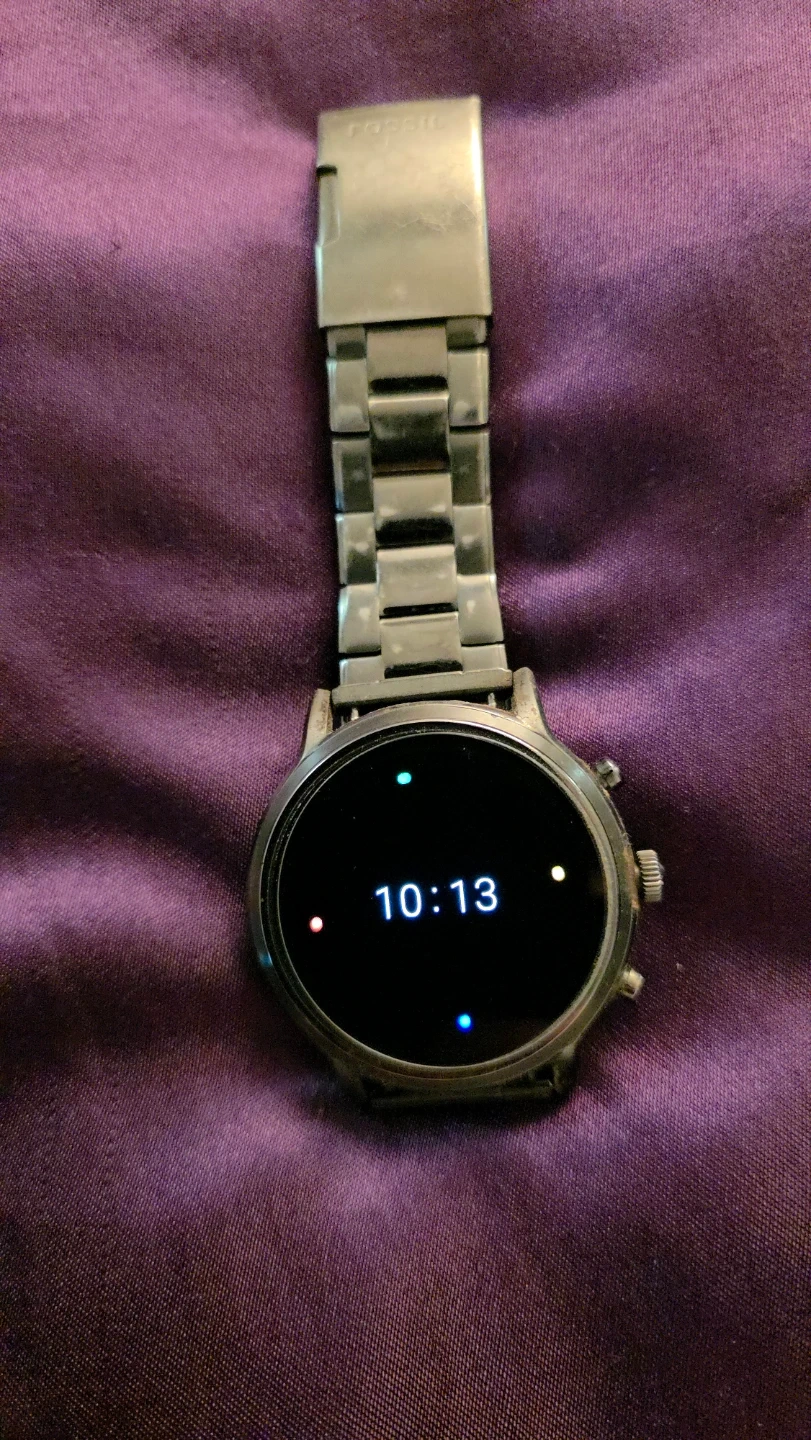 This is a Fossil Gen 5 smartwatch with a stainless steel band. It's in good working condition and comes with a screen protector The watch face is digital and shows the time and date.