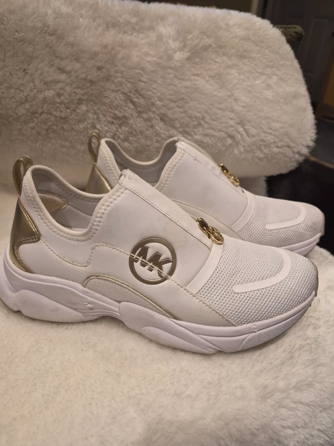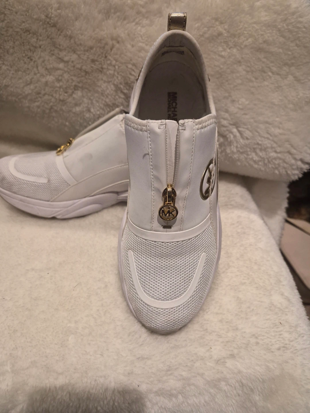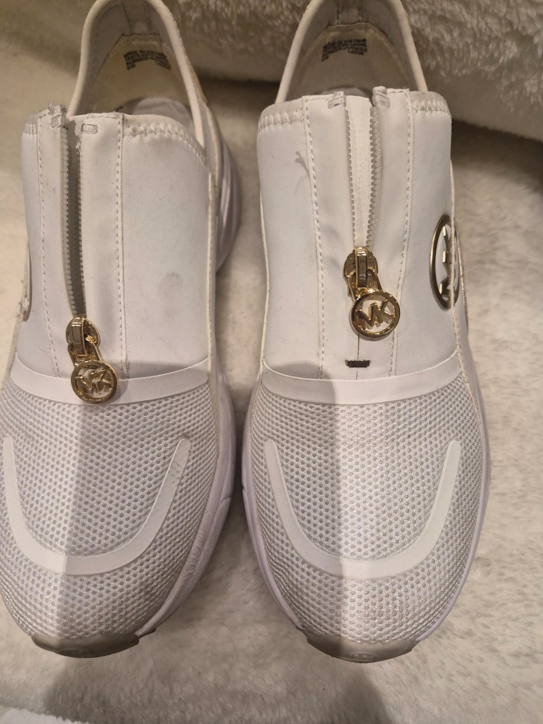 White slip-on sneakers from Michael Kors with gold accents. Features a decorative zipper on the front and a pull tab at the heel. Mesh detailing on the toe box.