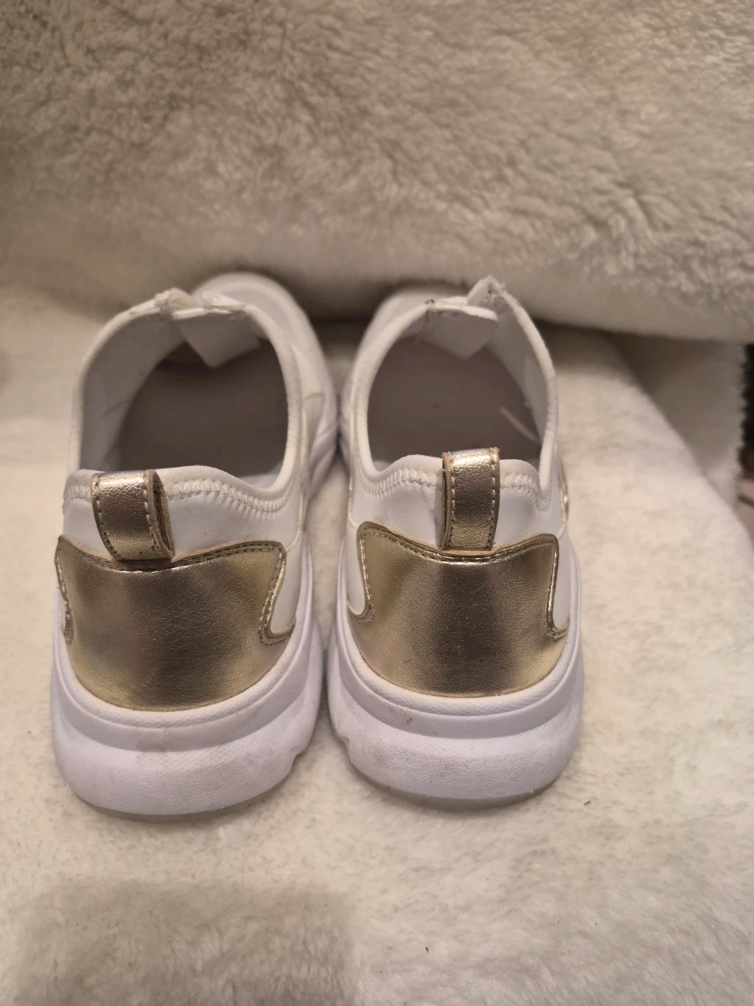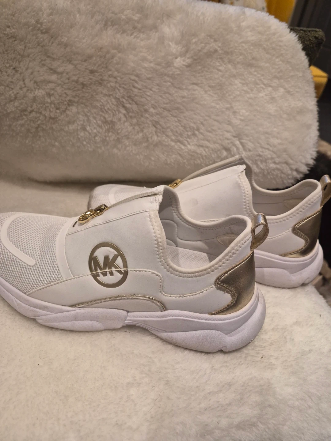 White slip-on sneakers from Michael Kors with gold accents. Features a decorative zipper on the front and a pull tab at the heel. Mesh detailing on the toe box.