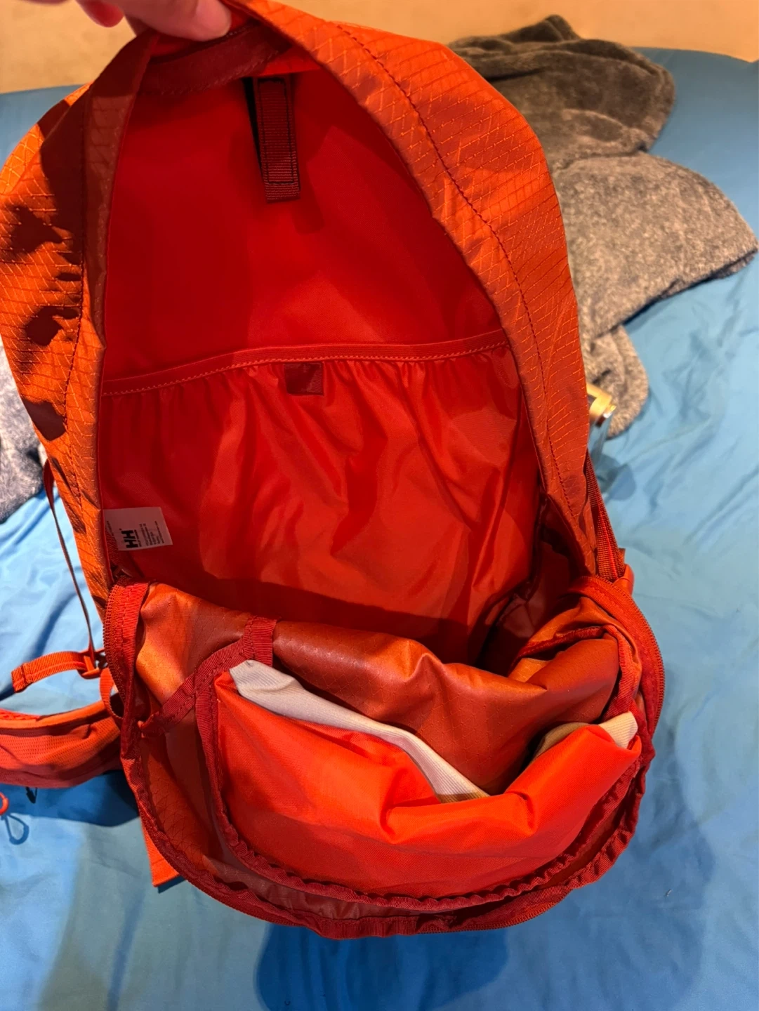 Orange Helly Hansen Generator 20L backpack. It's made of durable material and has adjustable straps for comfort. Plenty of space for your essentials! No stains, and just used it twice. Looks new.