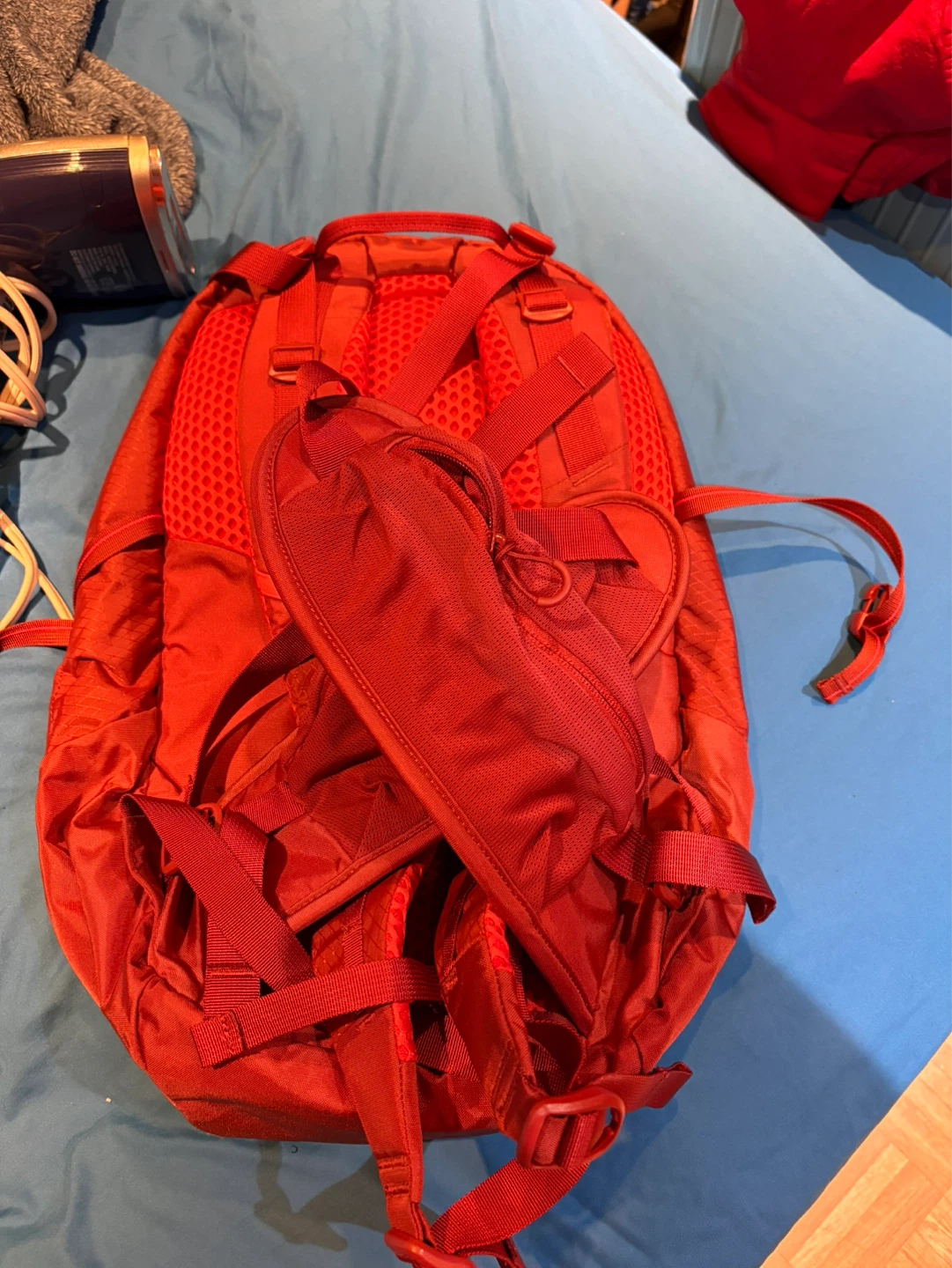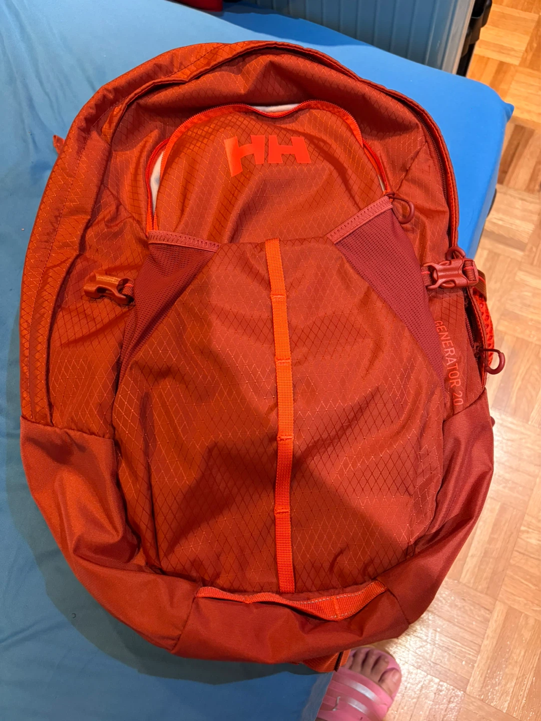 Orange Helly Hansen Generator 20L backpack. It's made of durable material and has adjustable straps for comfort. Plenty of space for your essentials! No stains, and just used it twice. Looks new.