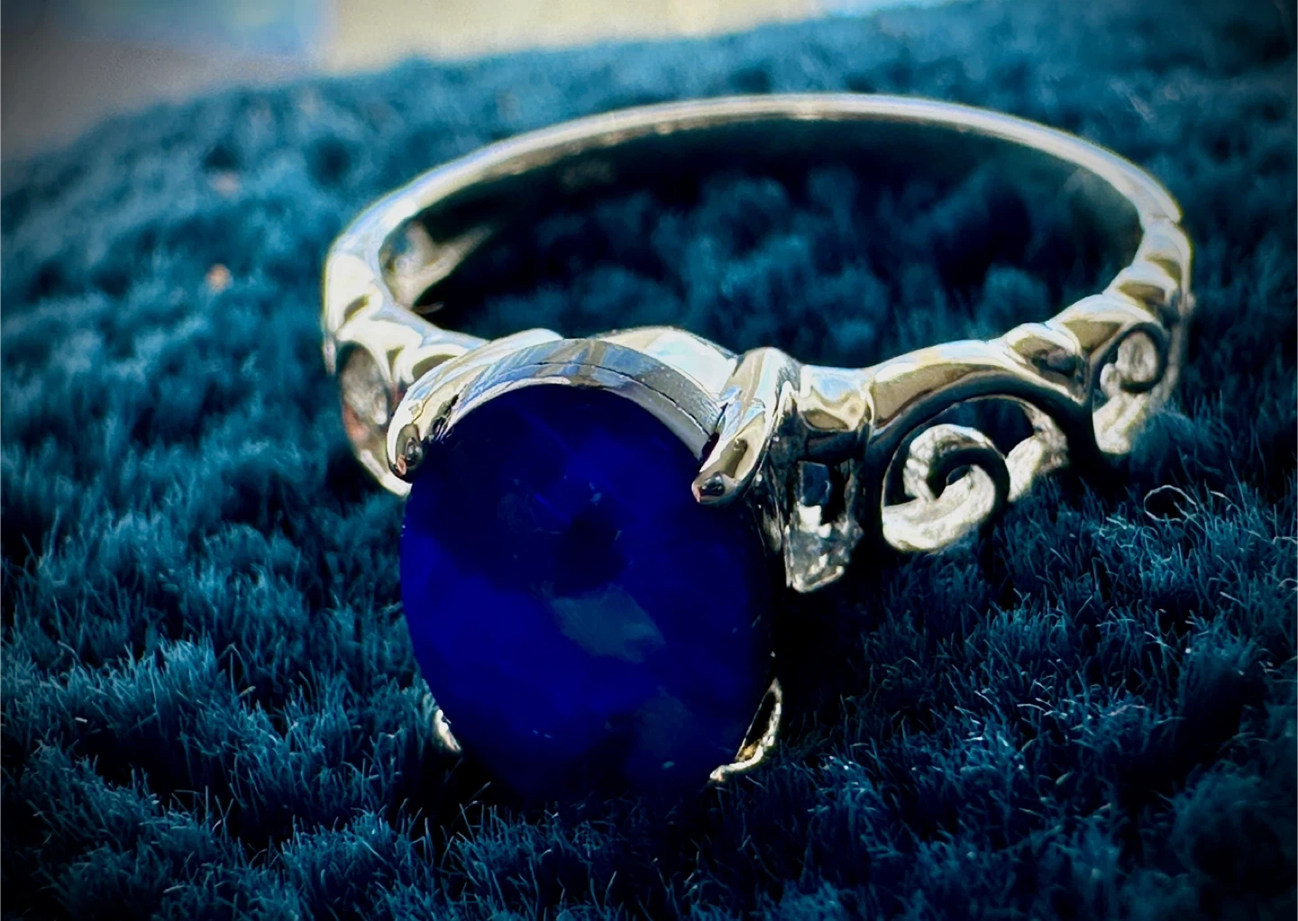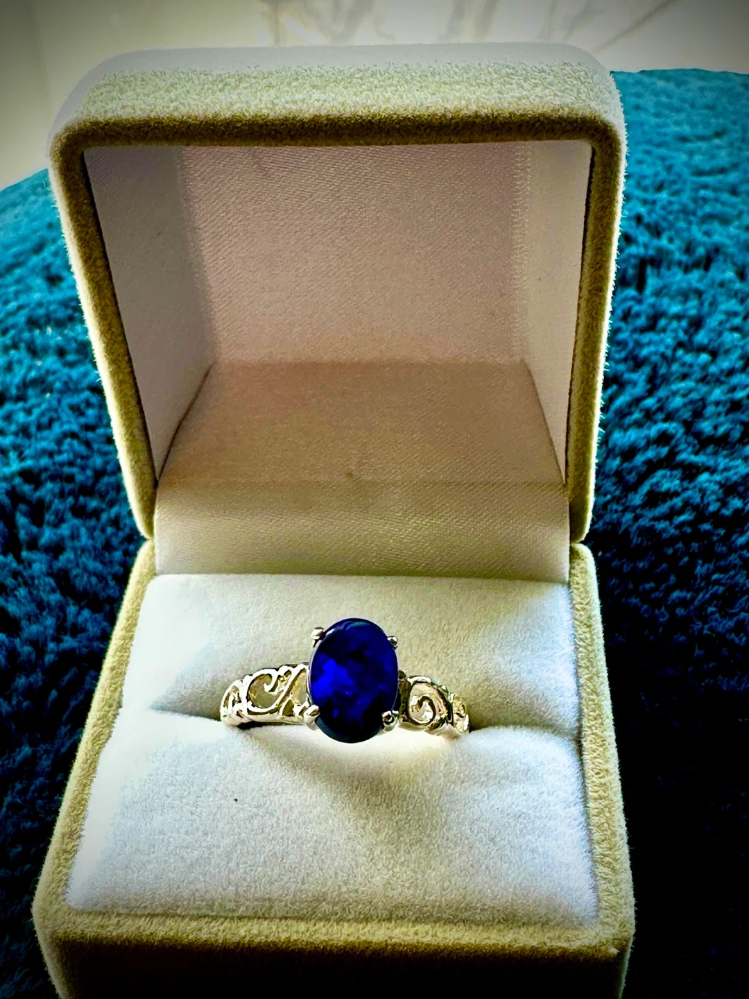 Brand New - This beautiful ring features a large, oval-cut Australian blue opal set in a sterling silver band. The band has intricate scroll detailing, giving it a vintage feel. The '925' stamp is visible, confirming it's sterling silver. It comes in a ring box.