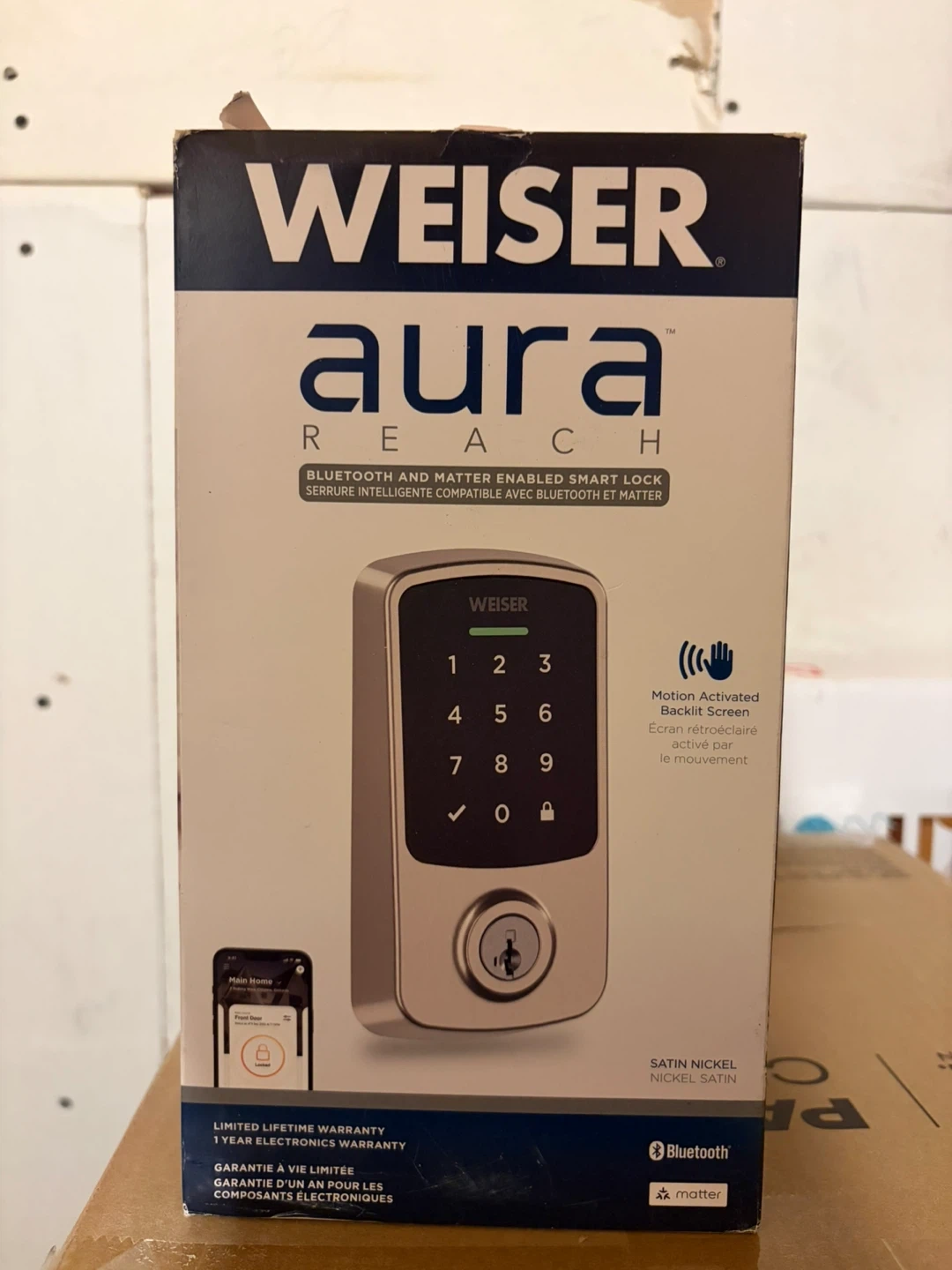 Selling several Weiser Aura Reach Bluetooth & Matter Enabled Smart Locks. They’re all brand new still sealed in the box. This Weiser Aura Reach smart lock. Features Bluetooth and Matter connectivity. Includes motion-activated backlit screen and SmartKey Security. Simple installation and setup. UL approved with 20 minutes fire-rated protection. Limited lifetime warranty on electronics.