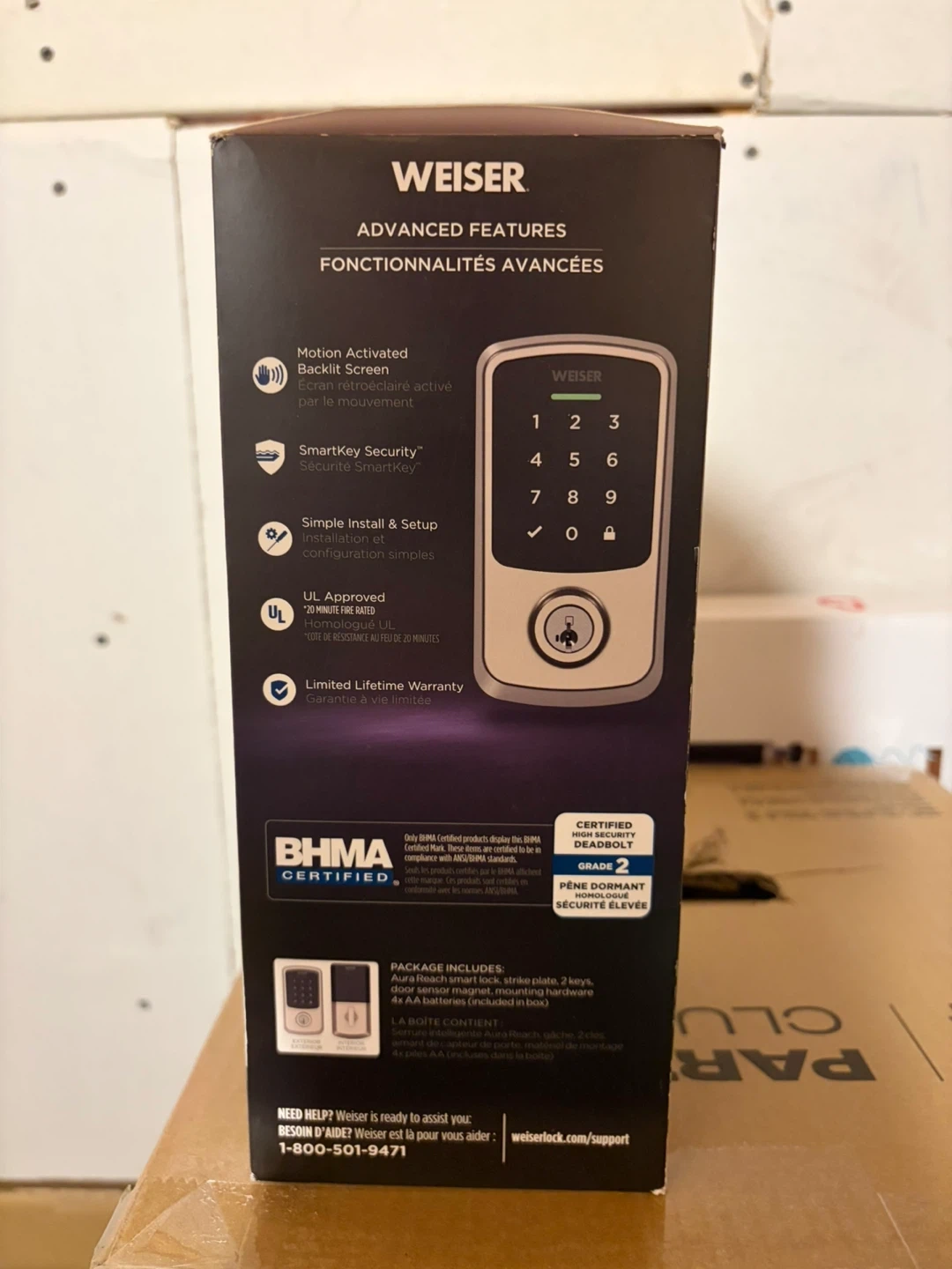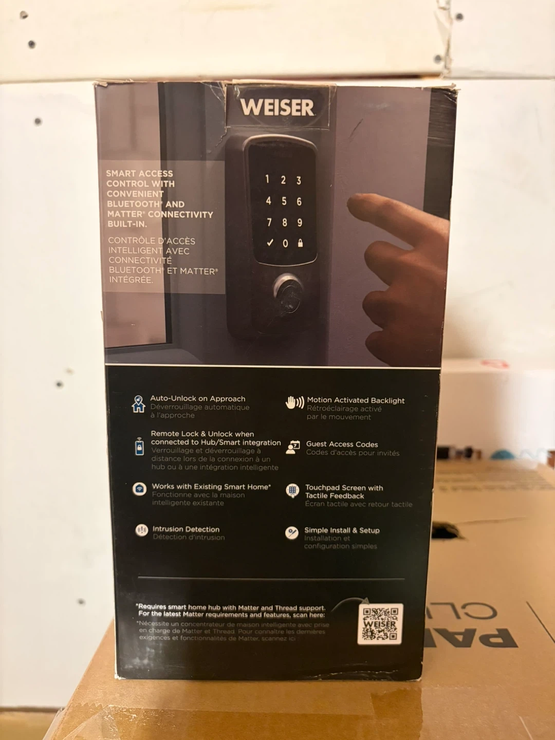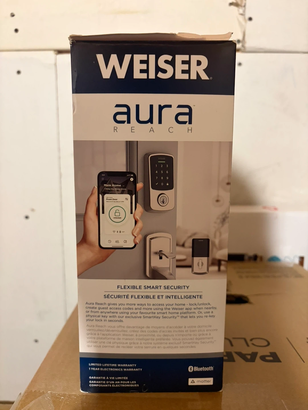 Selling several Weiser Aura Reach Bluetooth & Matter Enabled Smart Locks. They’re all brand new still sealed in the box. This Weiser Aura Reach smart lock. Features Bluetooth and Matter connectivity. Includes motion-activated backlit screen and SmartKey Security. Simple installation and setup. UL approved with 20 minutes fire-rated protection. Limited lifetime warranty on electronics.