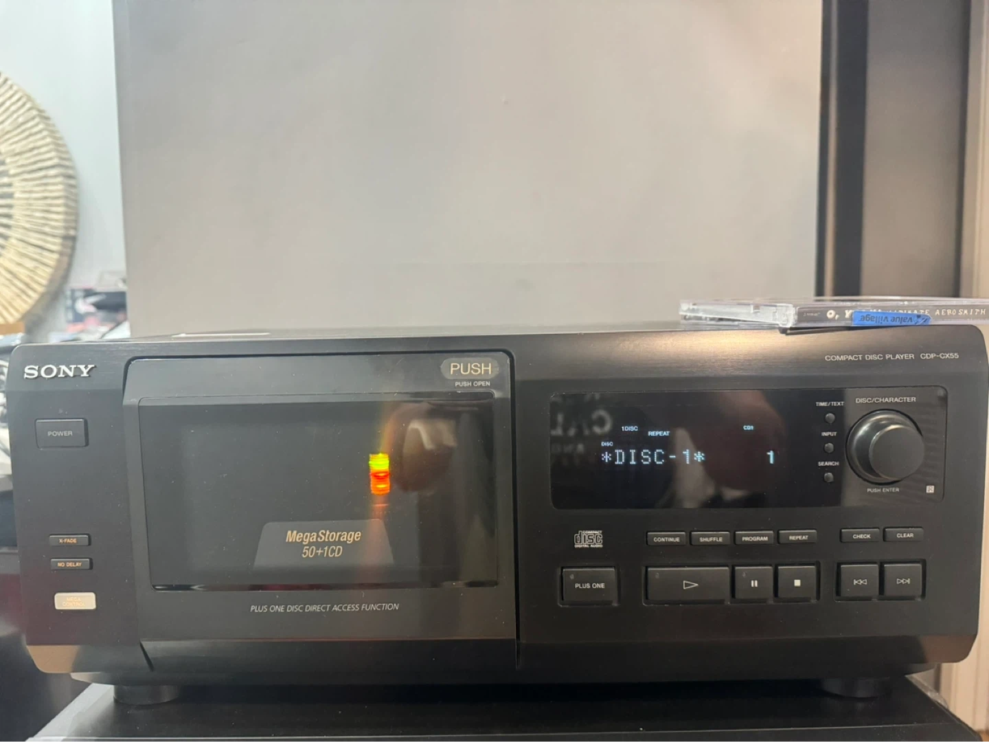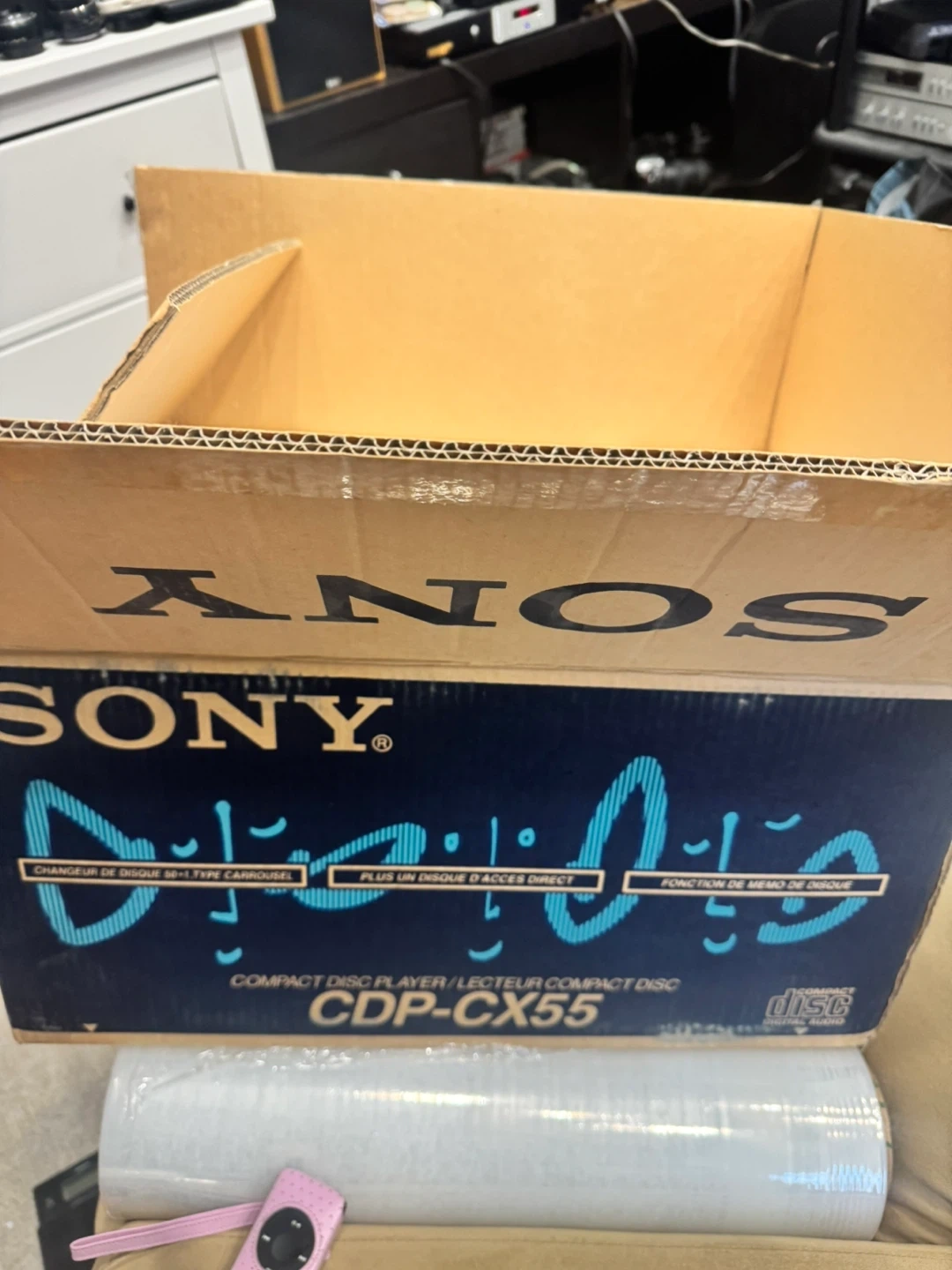 Sony 5-CD Changer Compact Disc Player, model CDP-CX55. Includes original box and remote. Features MegaStorage 50+1CD capability for extensive music collection playback. Perfect for audiophiles looking to manage their CD library.