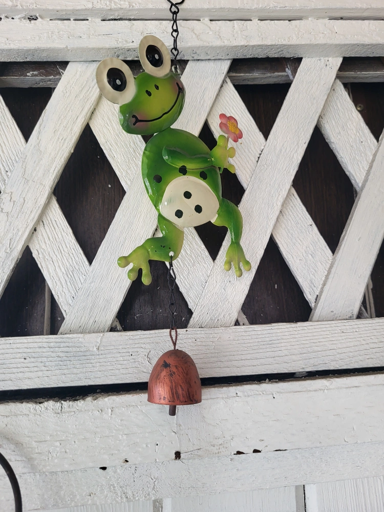 This is a cute frog decoration for your garden or patio! It has a little bell hanging from it that makes a gentle sound in the breeze. It's in great shape and would add a touch of whimsy to any outdoor space