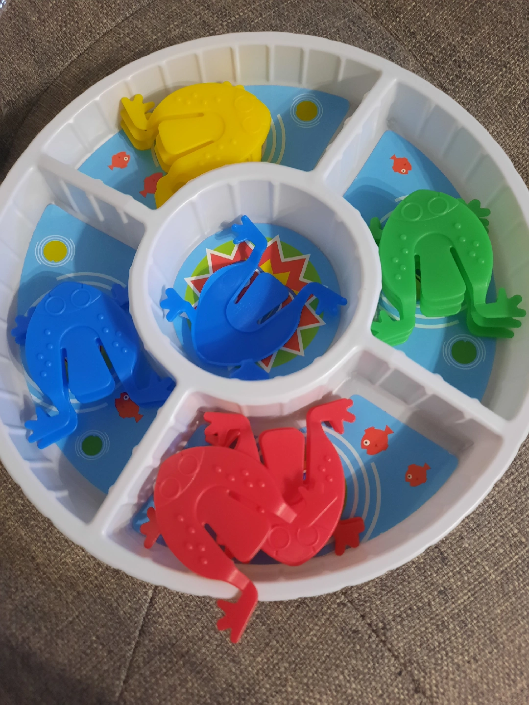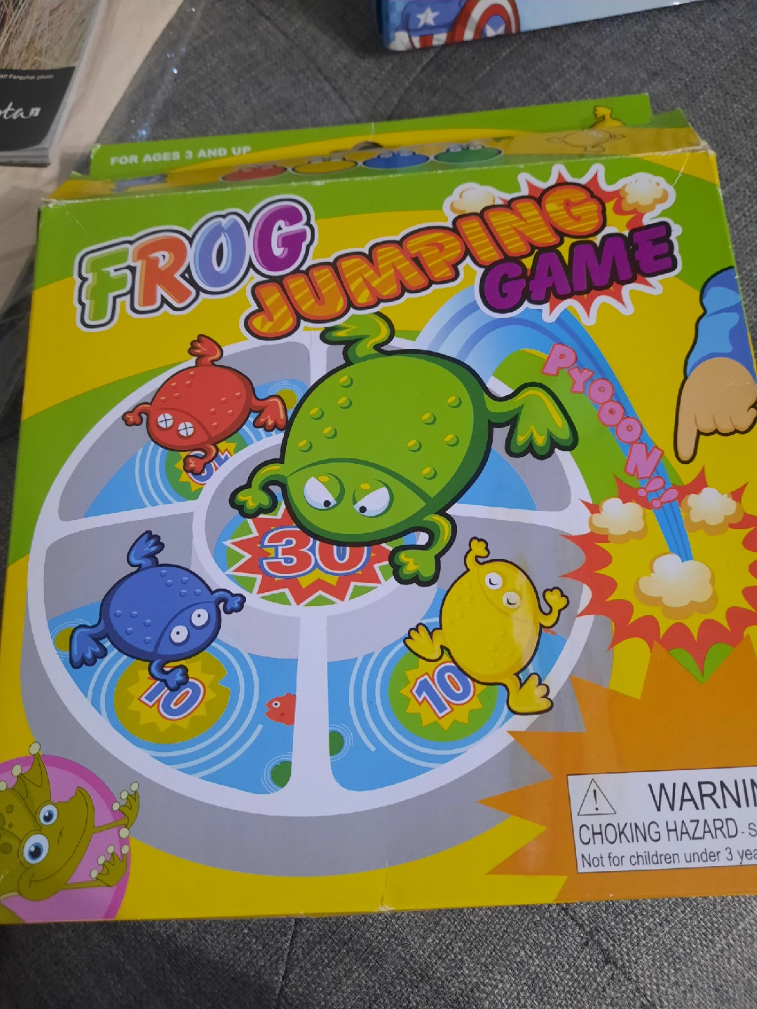 Selling a gently used Frog Jumping Game, perfect for kids ages 3 and up! It's a fun and engaging game that helps develop hand-eye coordination. Includes all the frog pieces and the game board. Get ready for some hopping good times!