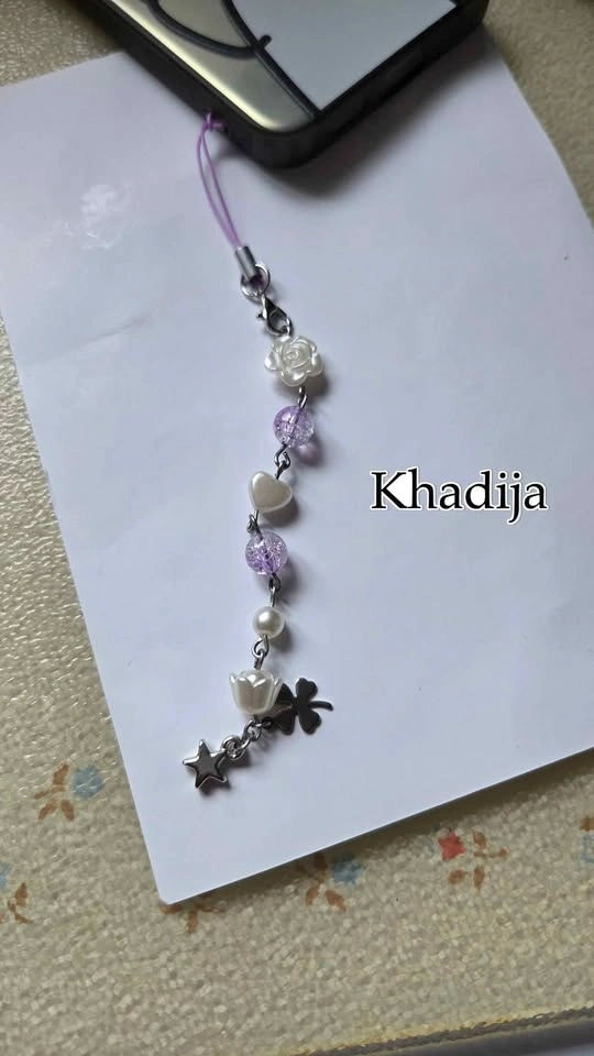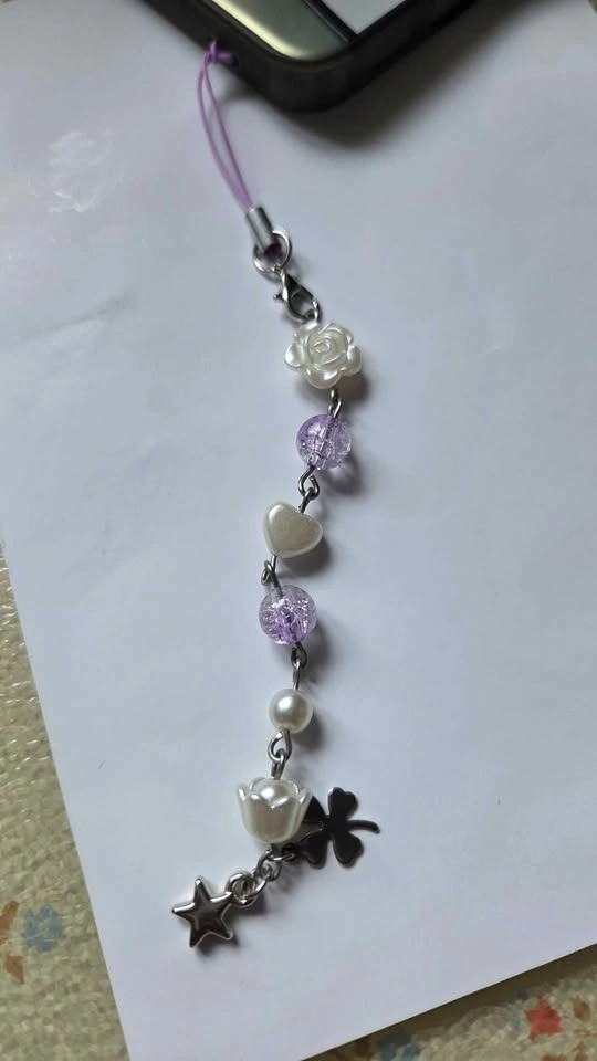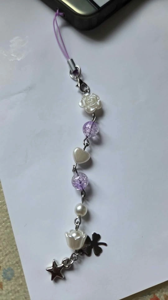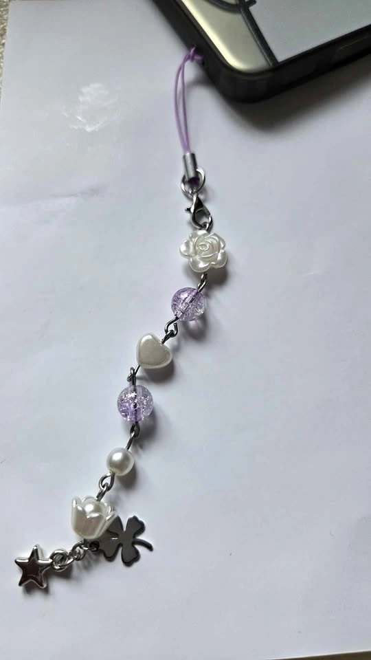 Add some personality to your phone or bag! This handmade charm features a beautiful mix of purple crackle beads, faux pearls, and cute silver accents. Perfect for anyone loving the coquette, soft girl, or Y2K aesthetic. Includes rose, heart, star, tulip, and four-leaf clover charms. Colorway: Lavender, White, and Silver. Condition: Brand New / Handmade. Versatile: Easily attaches to phone cases, cameras, bags, or wallets.