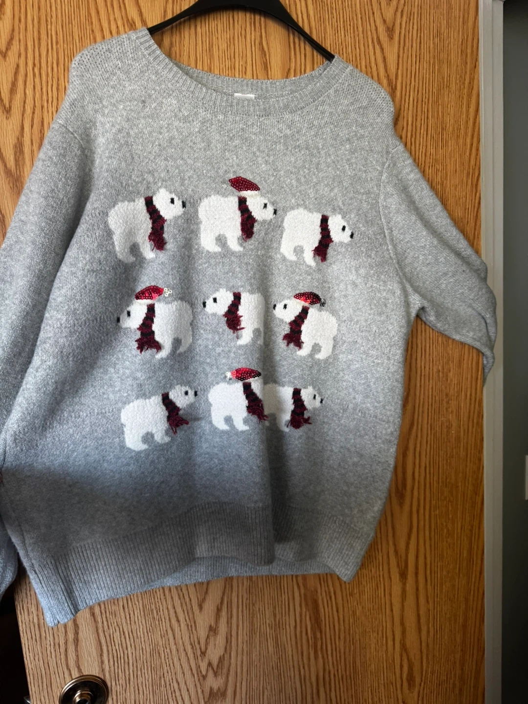 Cozy up in this grey Holiday Time sweater featuring a festive pattern of polar bears with red Santa hats and plaid scarves. It's a size 2X (20W-22W). Perfect for holiday gatherings!