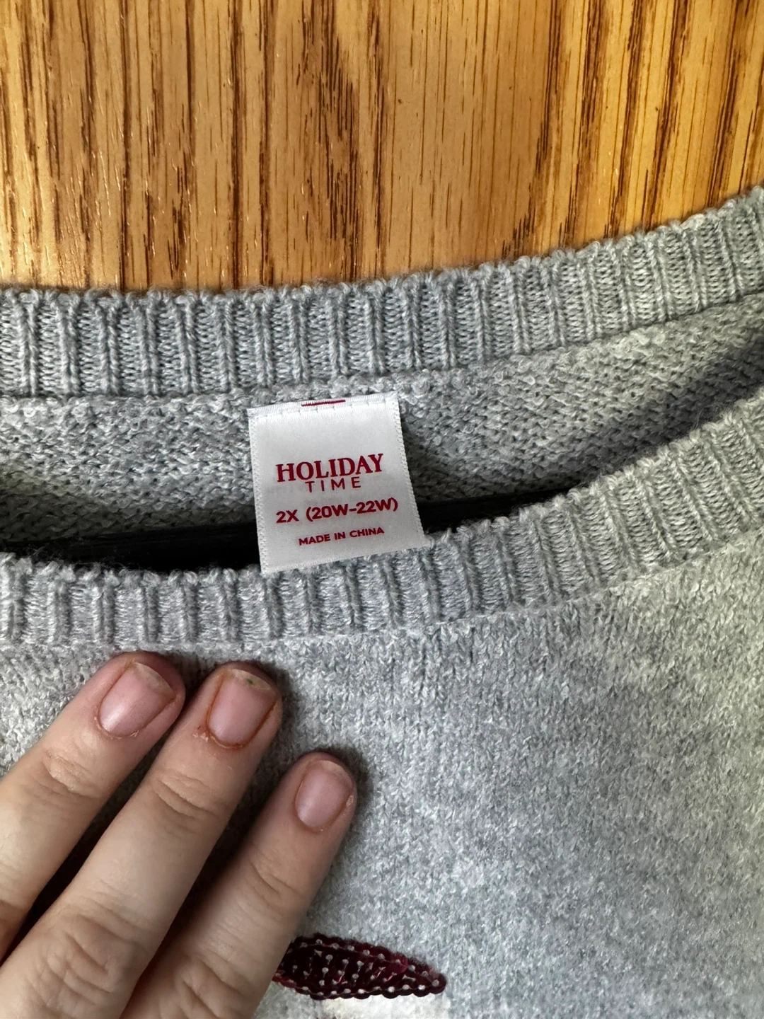 Cozy up in this grey Holiday Time sweater featuring a festive pattern of polar bears with red Santa hats and plaid scarves. It's a size 2X (20W-22W). Perfect for holiday gatherings!