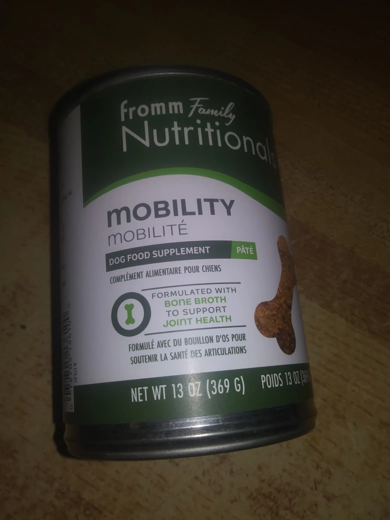 Selling a can of Fromm Family Nutritionals Mobility dog food supplement. It's a pate and is formulated with bone broth to support joint health. Net weight is 13 oz (369 g).