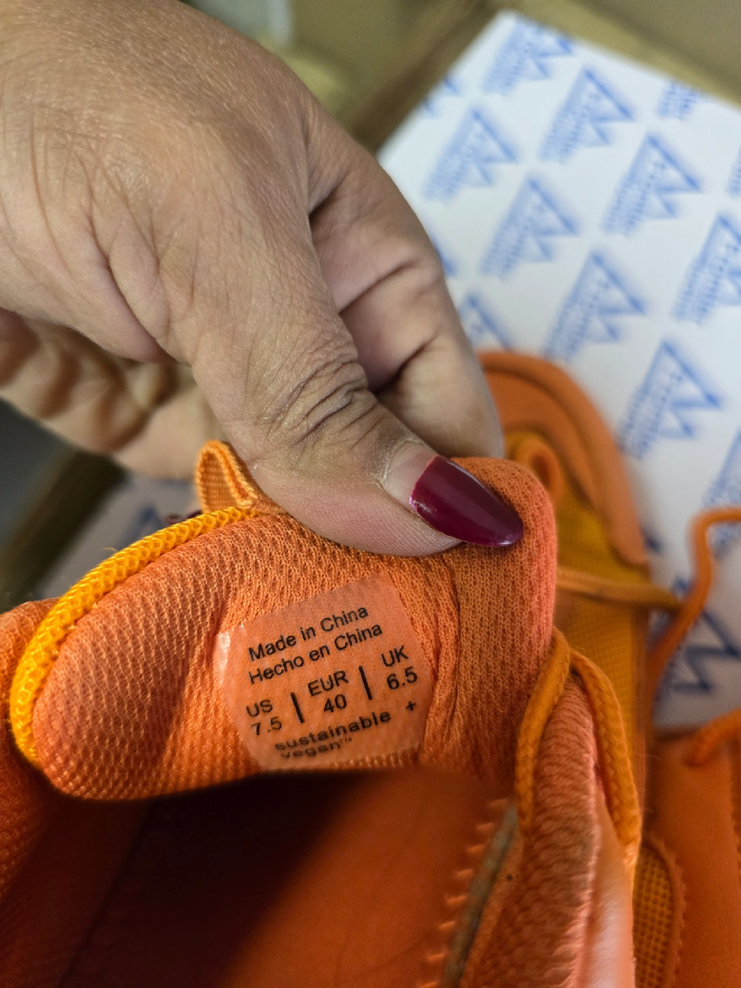 Selling a pair of Frontier North sneakers in a vibrant orange colour! They're a US size 7.5, EUR 40, and UK 6.5. These sneakers are marked as 'Sustainable Vegan', so they're a great choice if you're looking for eco-friendly footwear