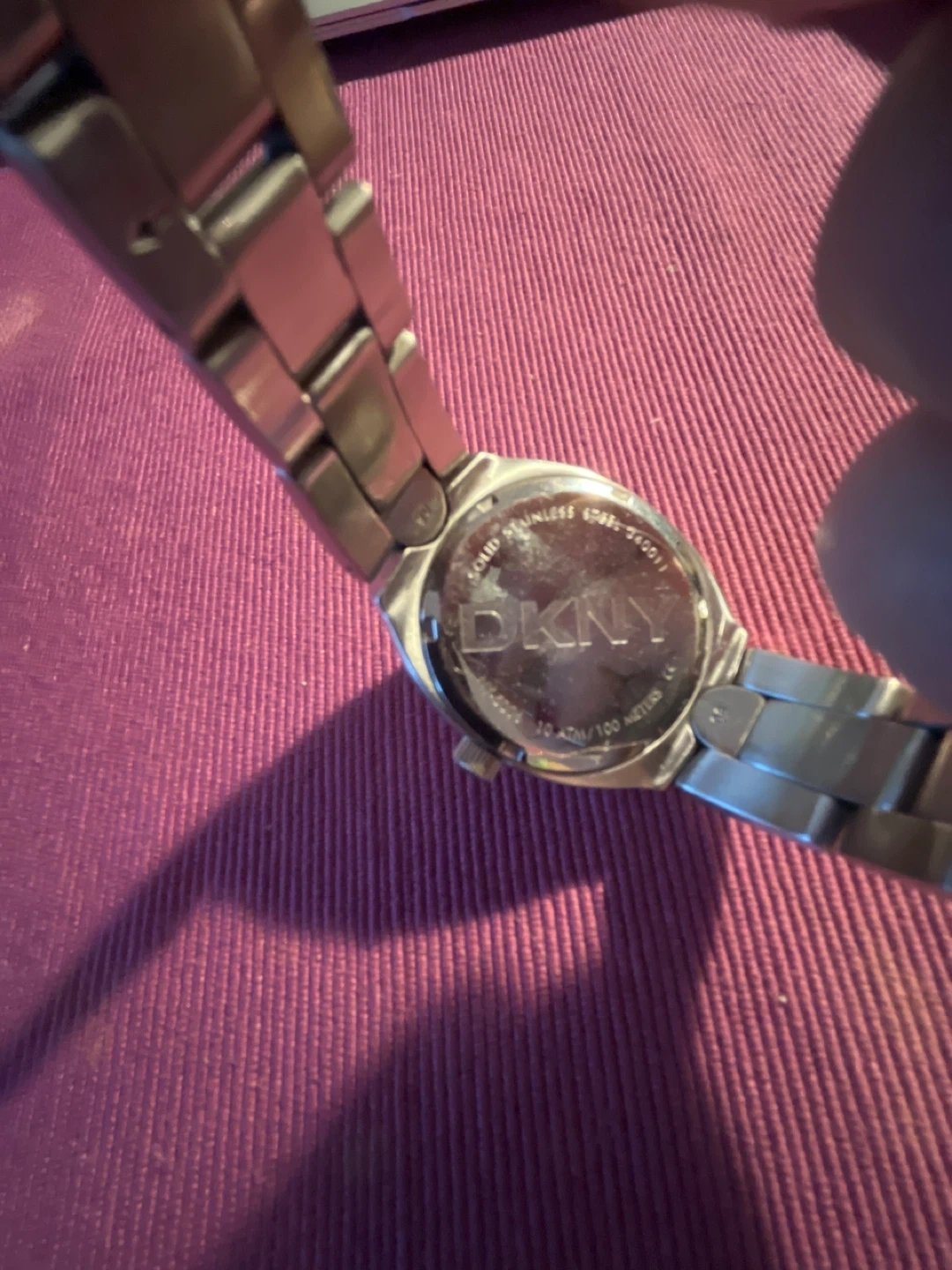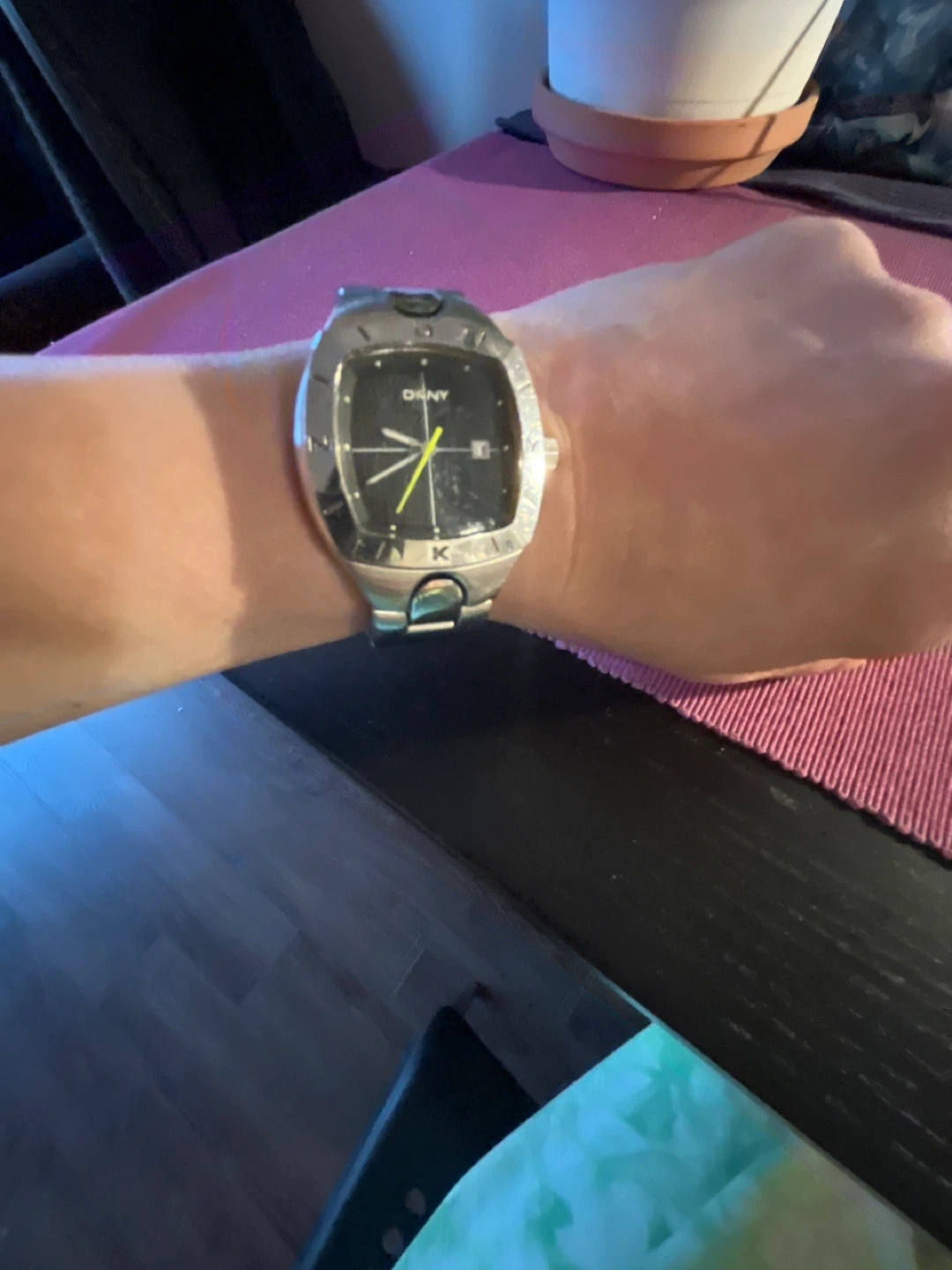 Selling a DKNY men's watch. The watch is stainless steel with a black face and silver band. It has some minor wear and tear, but is still in good condition and fully functional