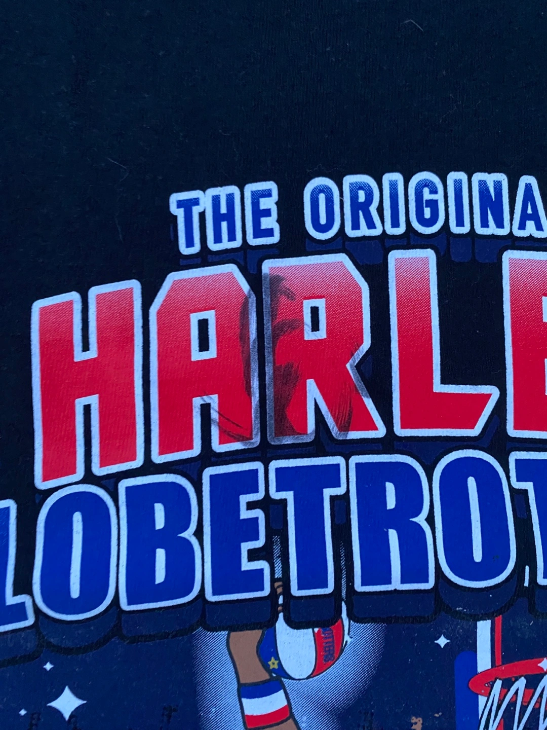 Never worn Black t-shirt. Features Harlem Globetrotters logo and world tour graphic. Multiple country flags displayed. Short sleeves. Men's size. With Five different signatures.