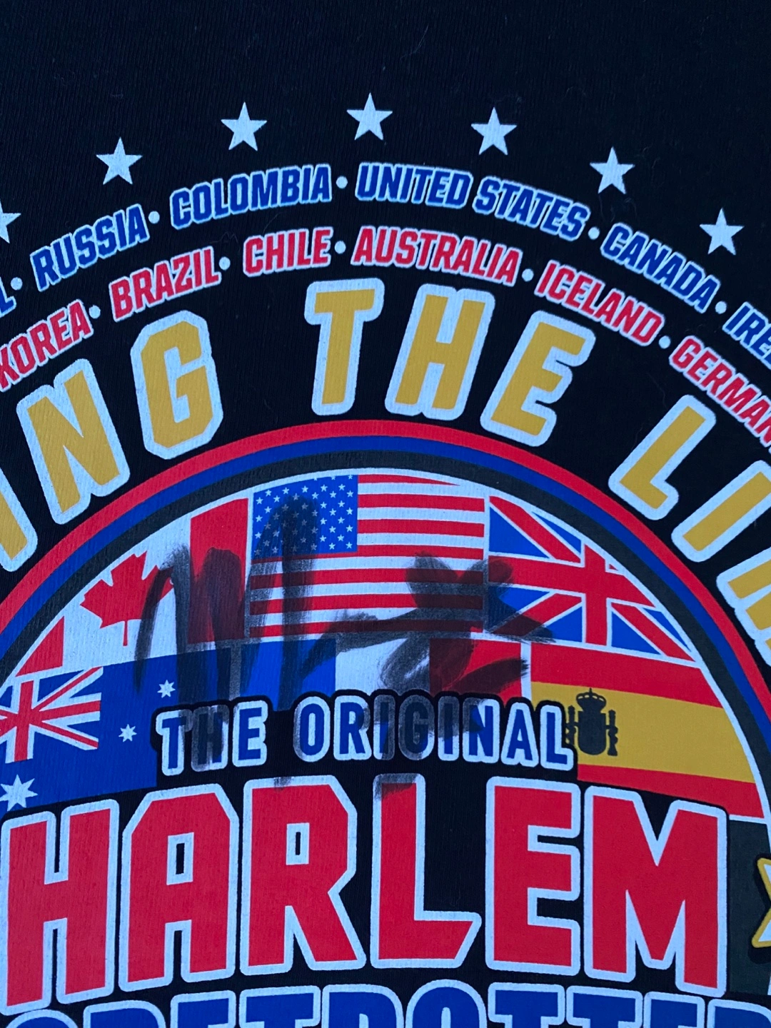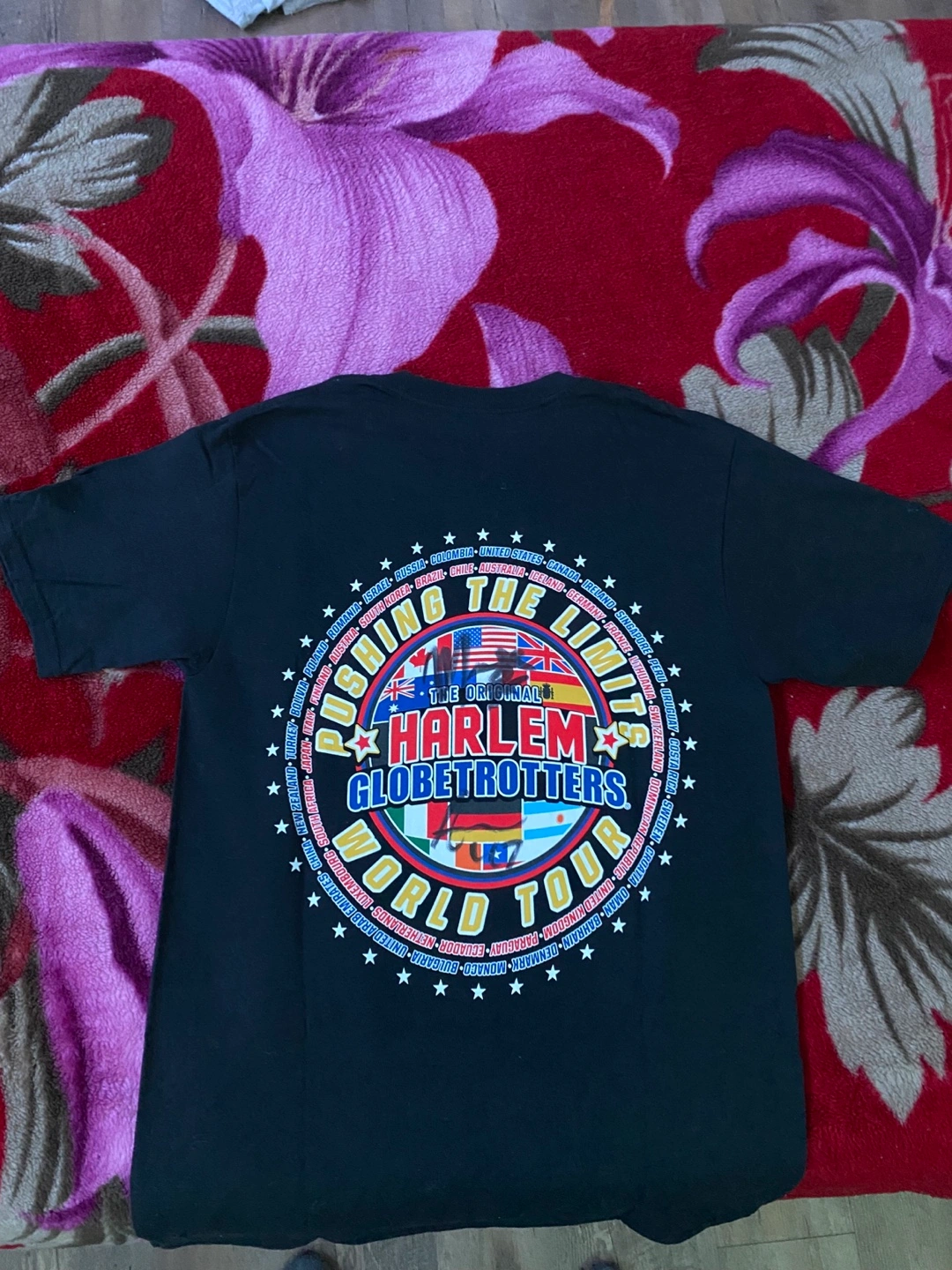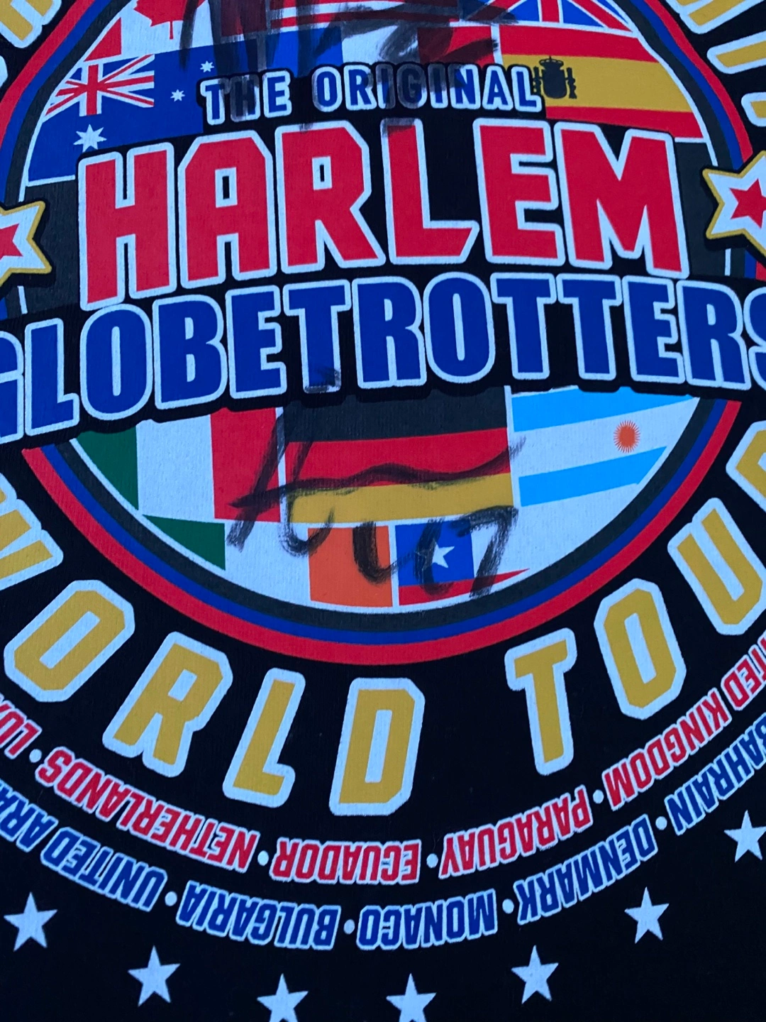 Never worn Black t-shirt. Features Harlem Globetrotters logo and world tour graphic. Multiple country flags displayed. Short sleeves. Men's size. With Five different signatures.