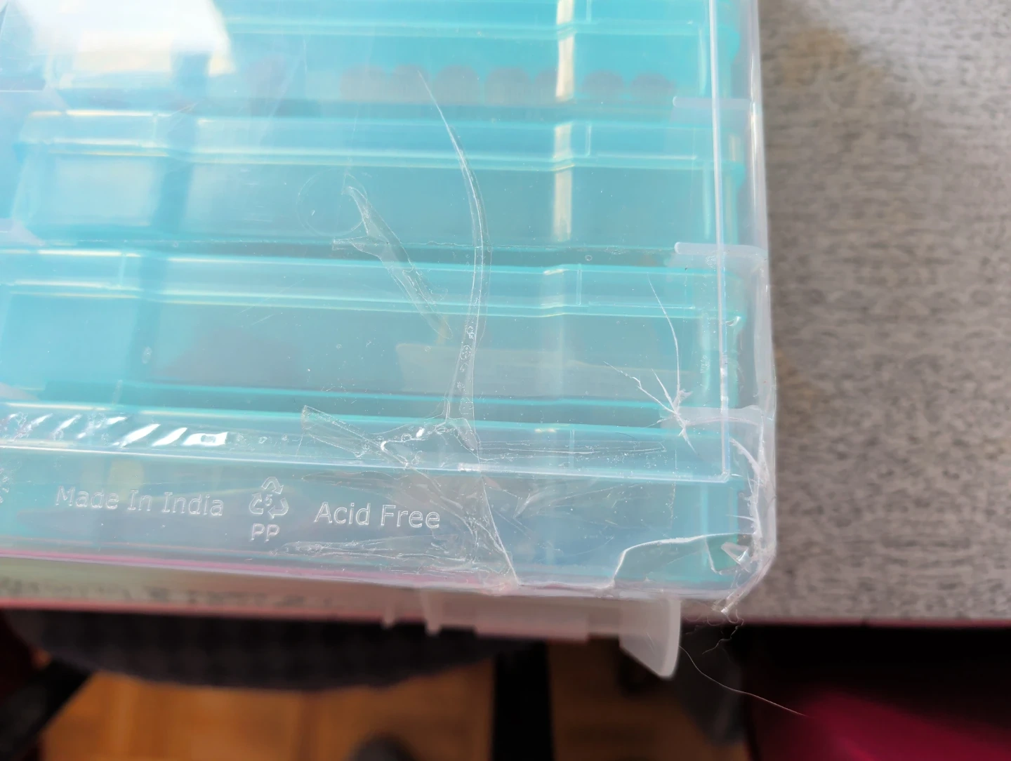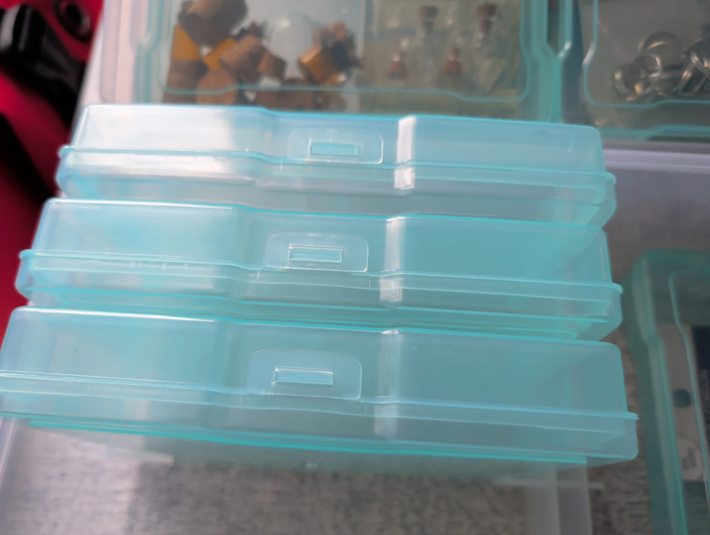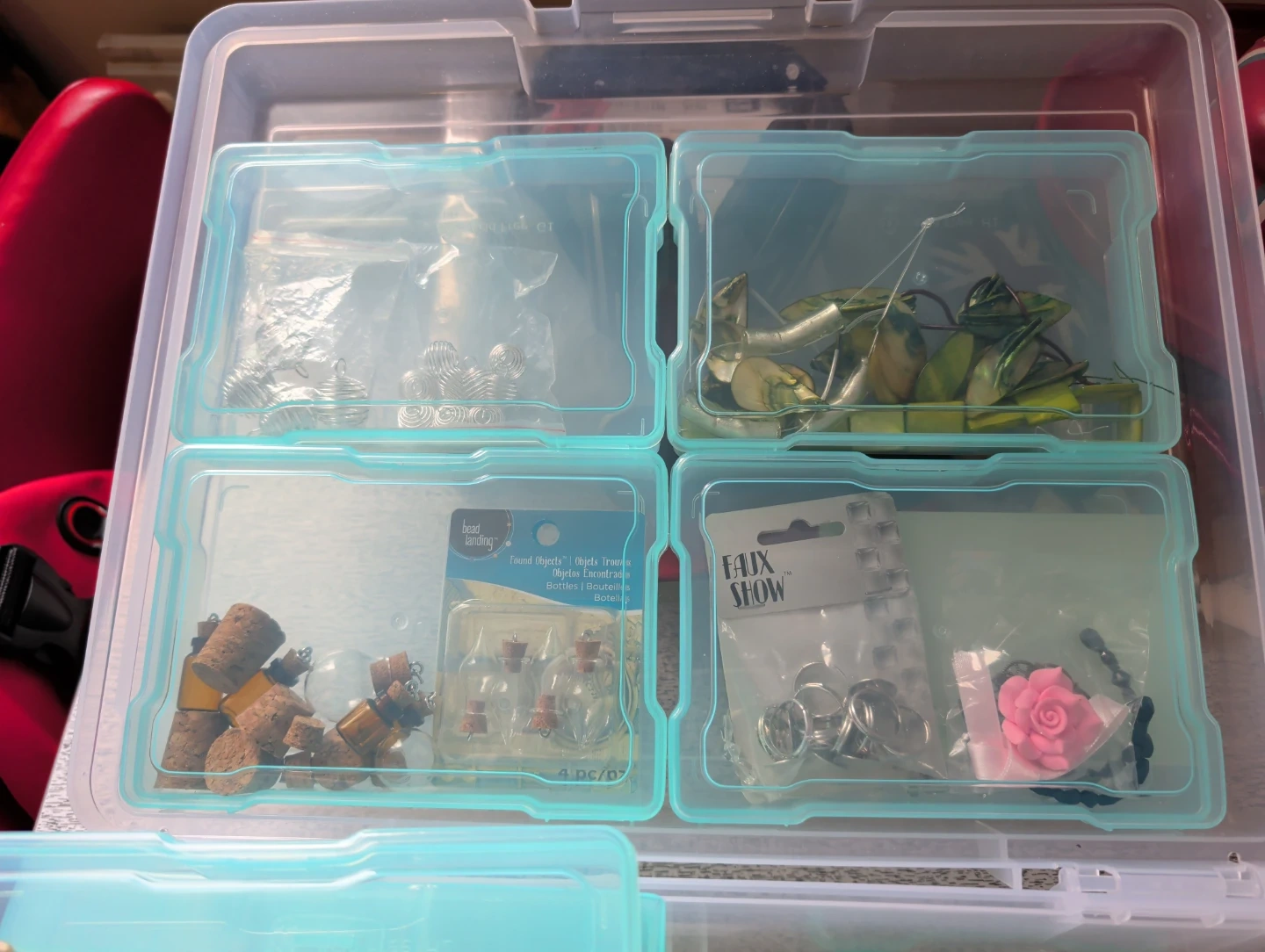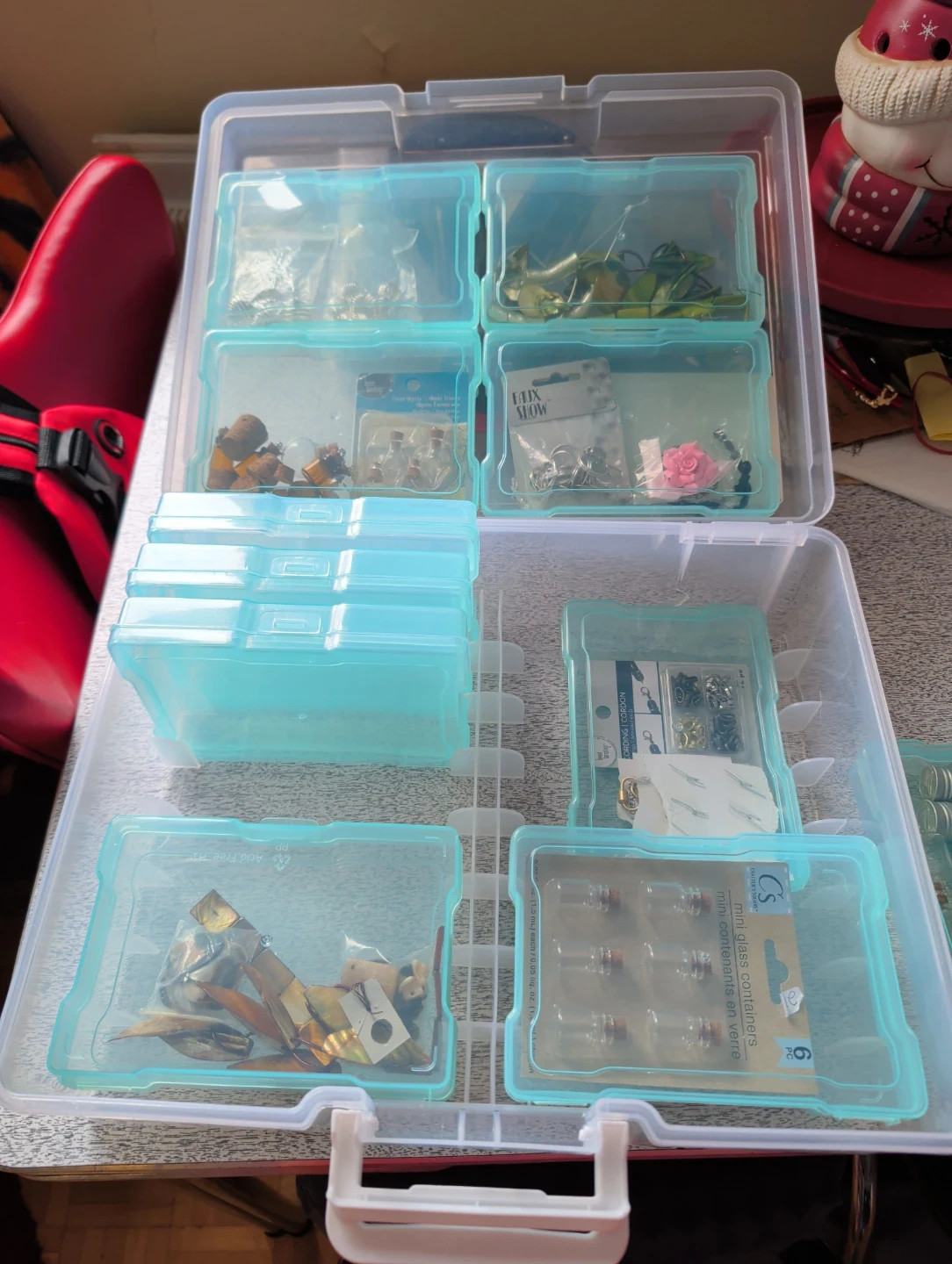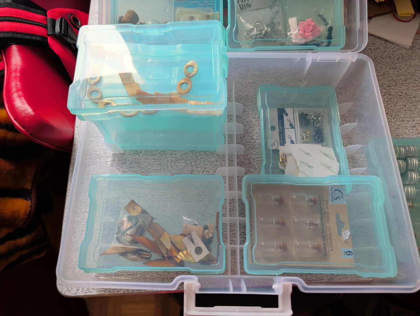 This is a clear plastic storage organizer box with multiple small compartments. It's great for storing small craft supplies like beads, charms, findings, and tiny bottles. The removable inner boxes help keep items sorted and tidy.
