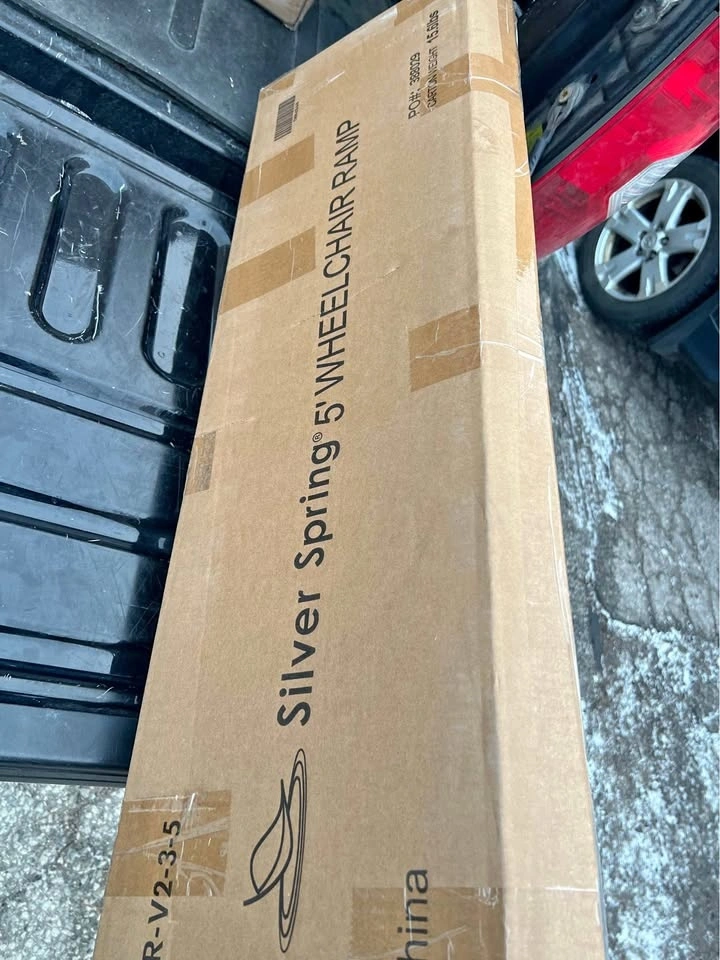 This is a Silver Spring single-fold wheelchair ramp, 5 feet long and 29 inches wide. It's made of high-strength, lightweight aluminum with a 600-pound weight capacity. The ramp folds in half for easy transport and storage. It features a textured, non-slip surface, 2-inch side rails, and a solid full-plate lip for safety. It includes steel security pins and built-in carrying handles. The maximum rise it accommodates is 4 inches. When folded, it measures 30 x 15 inches. The overall dimensions are 60 x 30 x 1.25 inches, and it weighs 12 pounds. This ramp is great for making mobility and accessibility easier for wheelchairs, scooters, and other uses.