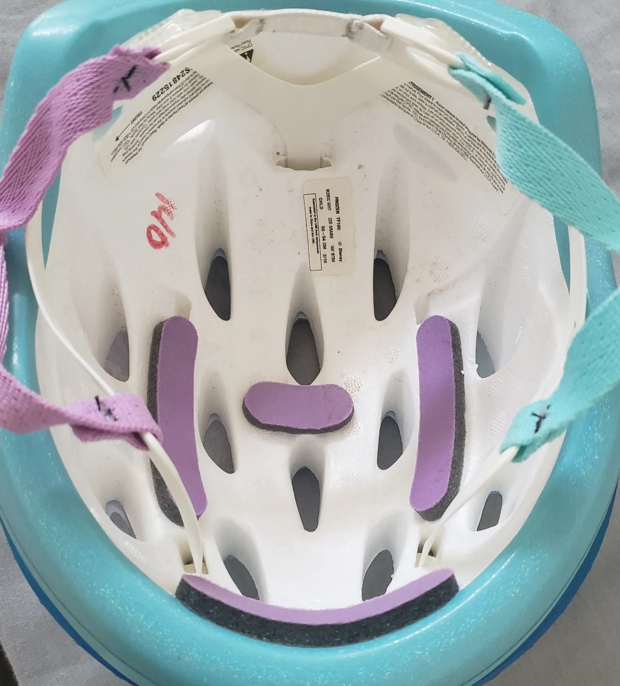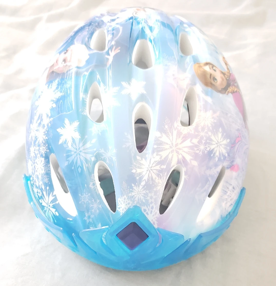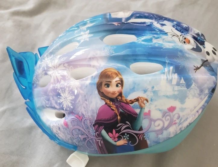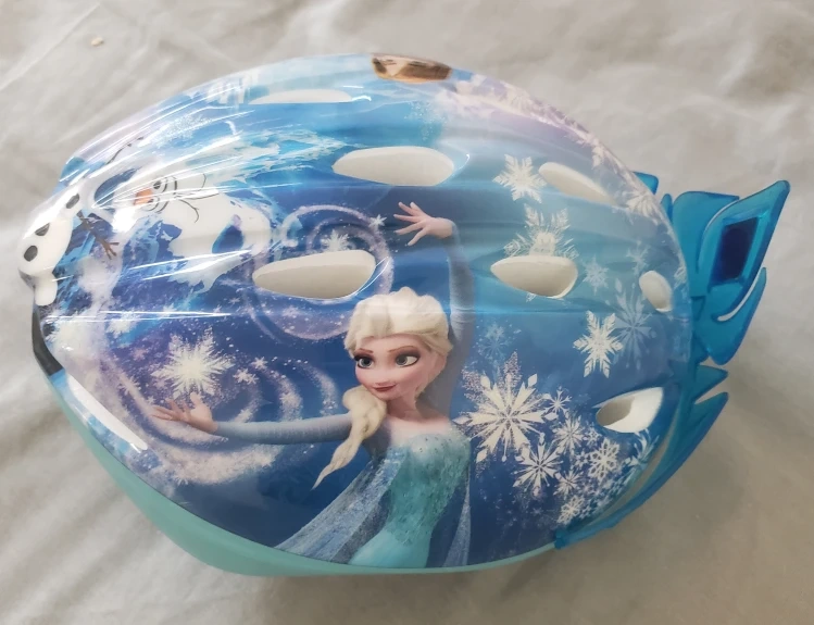 Child's bike helmet. Features Frozen characters. Adjustable straps. Lightweight design. Great for cycling, scootering, and other activities.