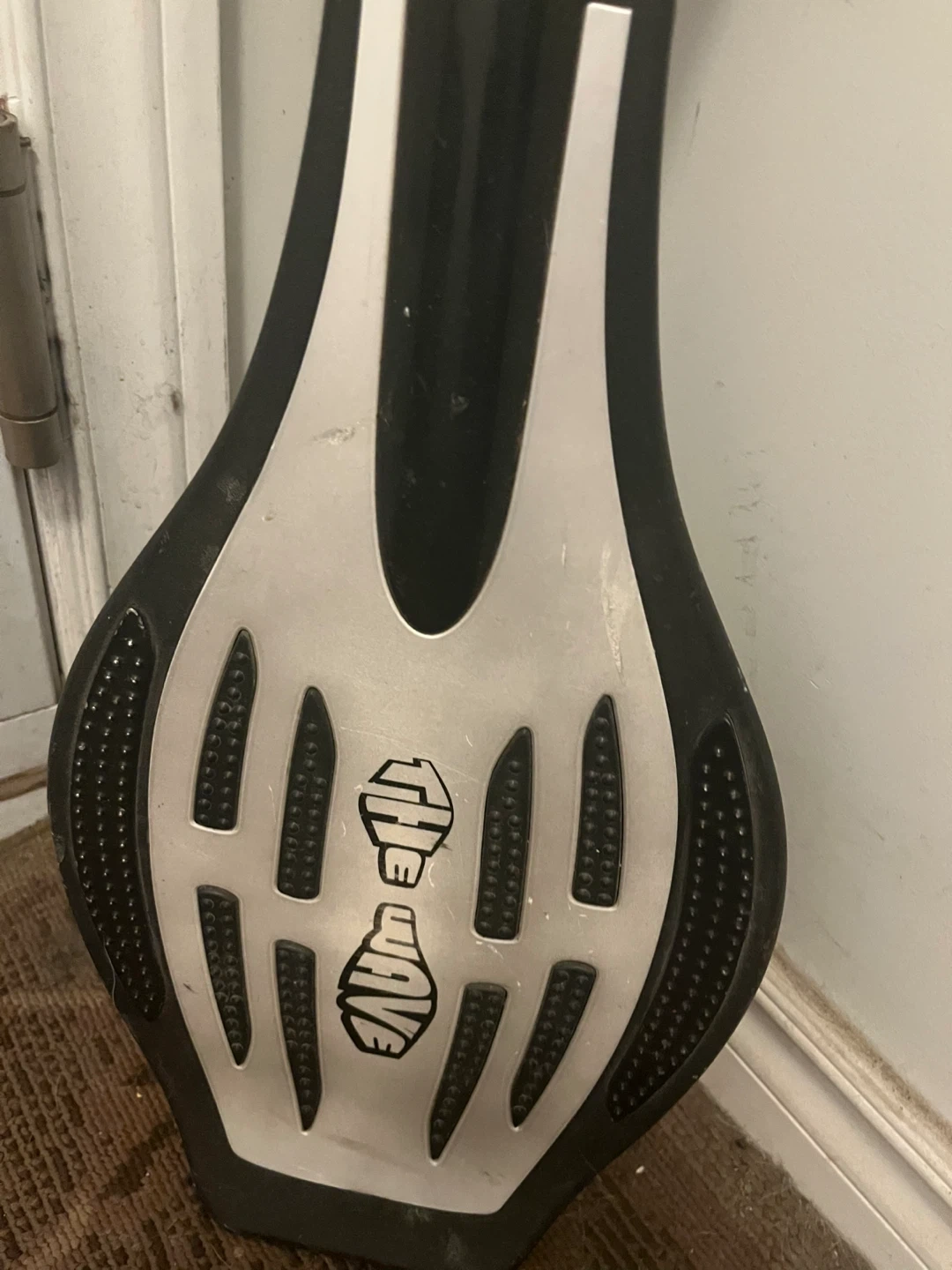 This is a Street Surfing wave board. It's black and silver with a split deck design and three wheels per side. It offers a unique way to cruise around!