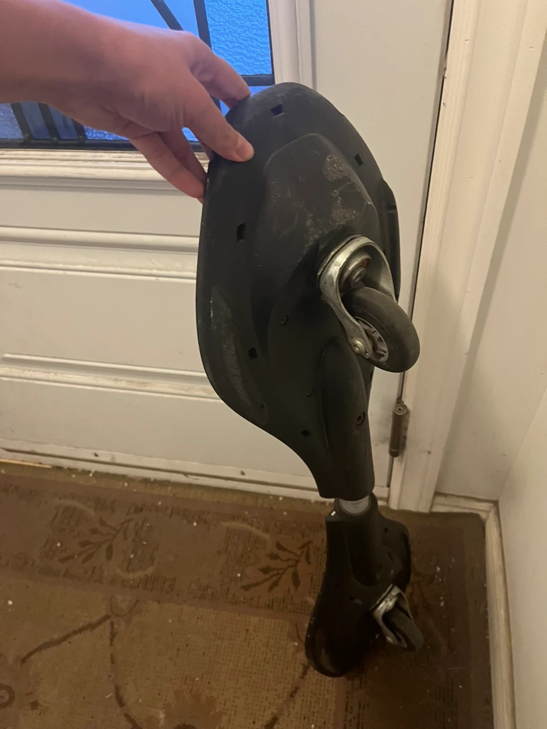 This is a Street Surfing wave board. It's black and silver with a split deck design and three wheels per side. It offers a unique way to cruise around!
