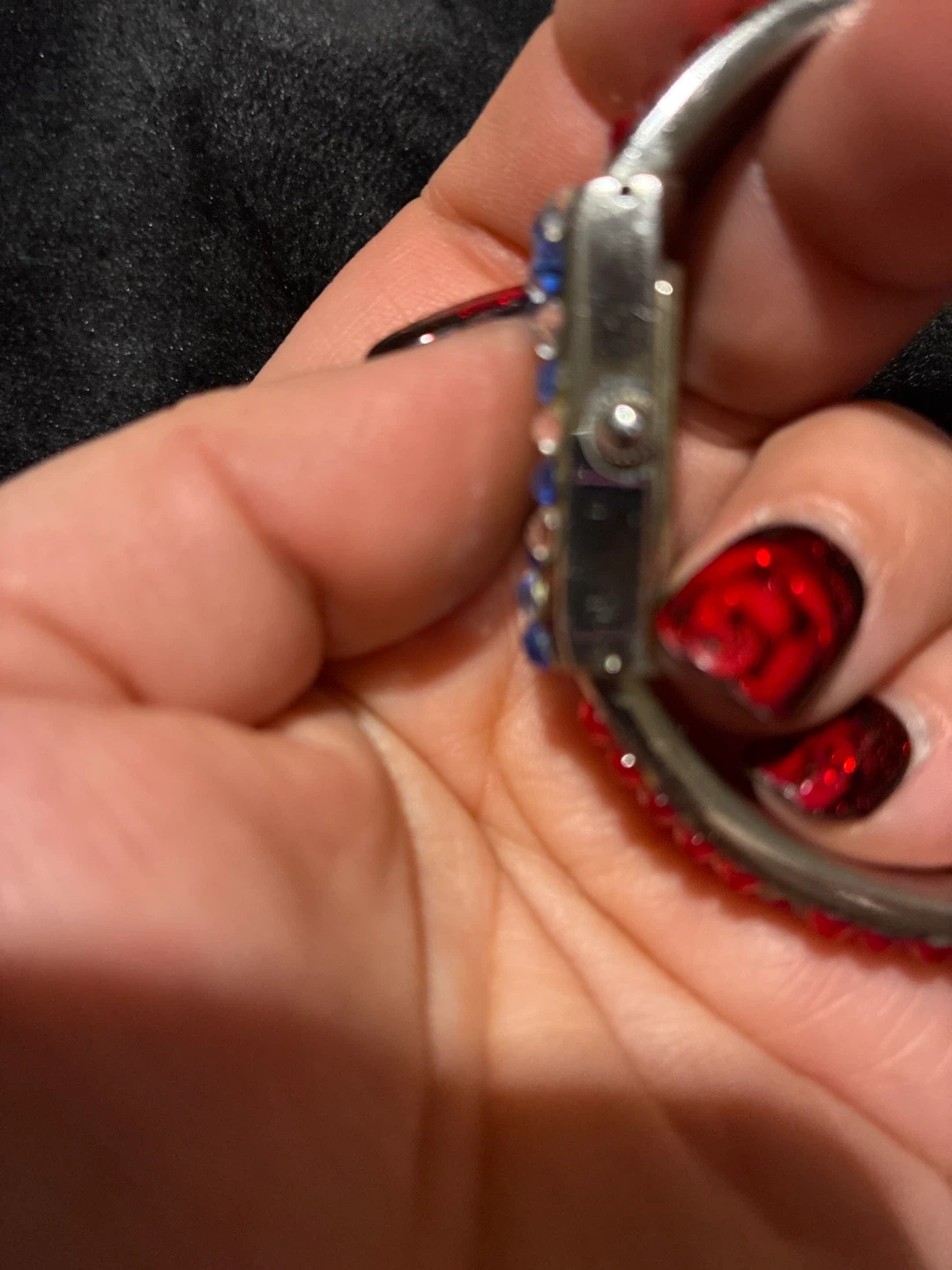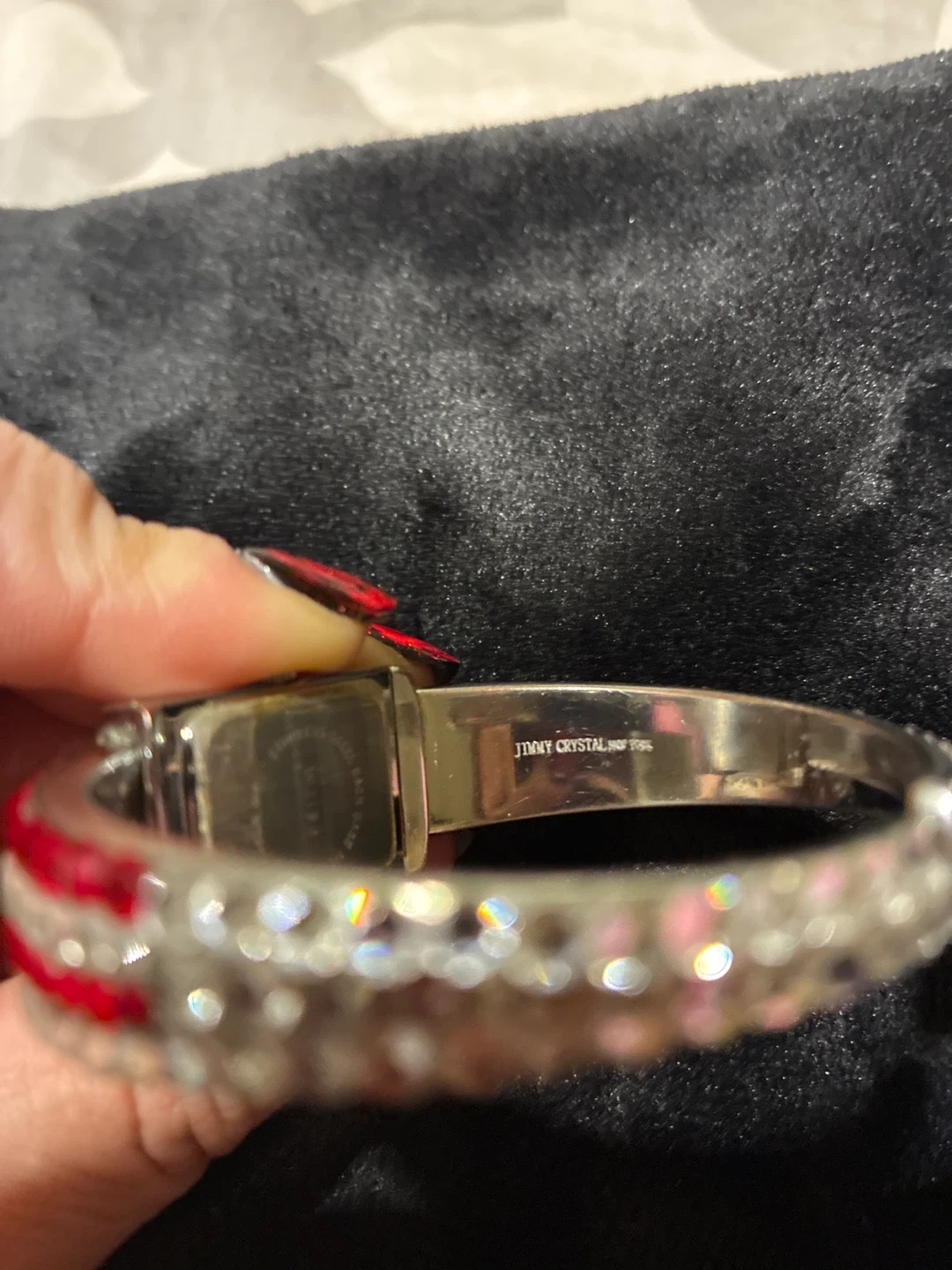 Sparkling watch with red and blue crystal accents. Features a rectangular face with a silver-tone band. It's a stylish accessory for any occasion by Jimmy Crystal.