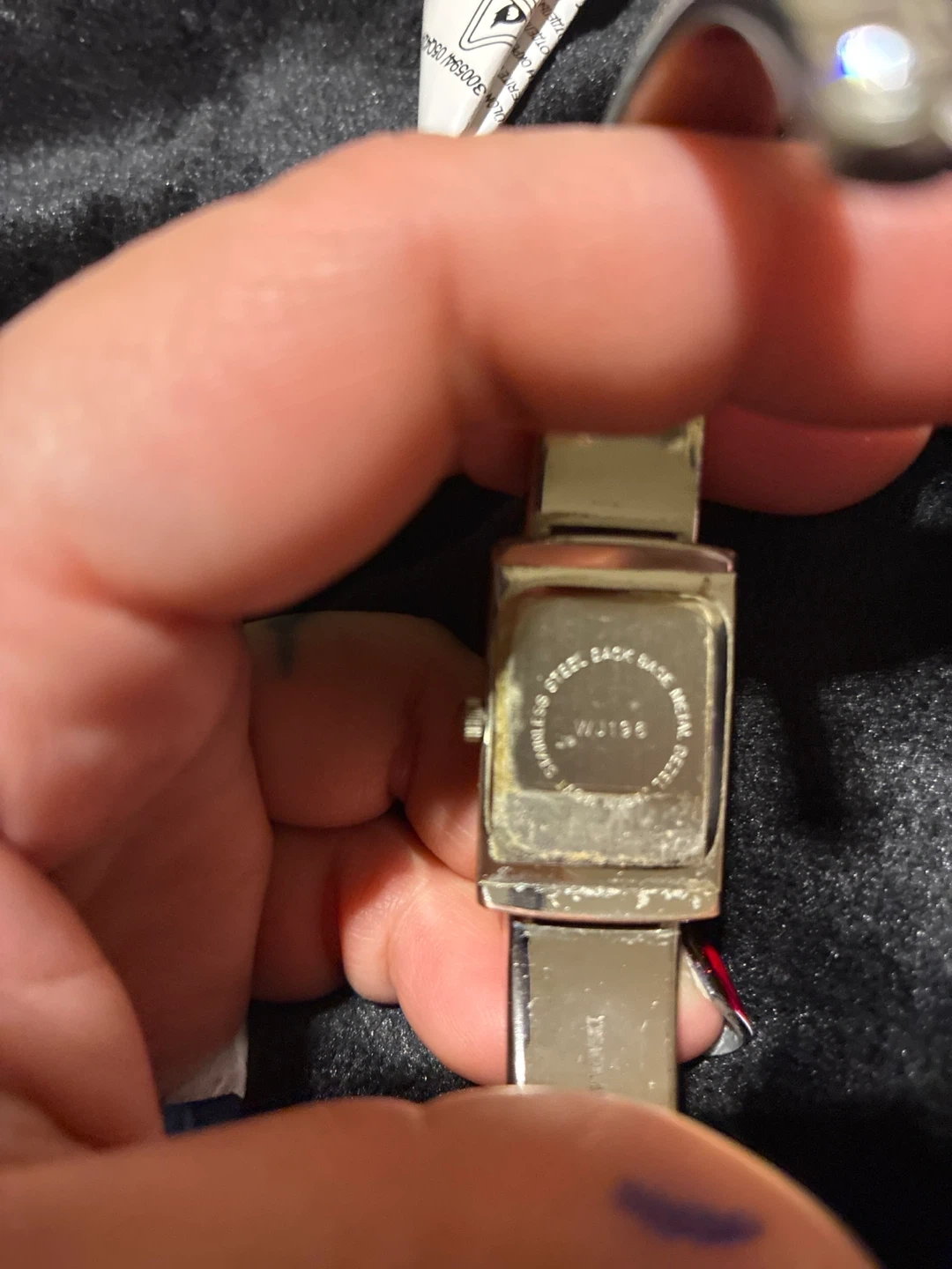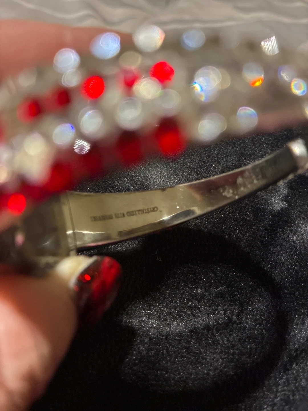 Sparkling watch with red and blue crystal accents. Features a rectangular face with a silver-tone band. It's a stylish accessory for any occasion by Jimmy Crystal.