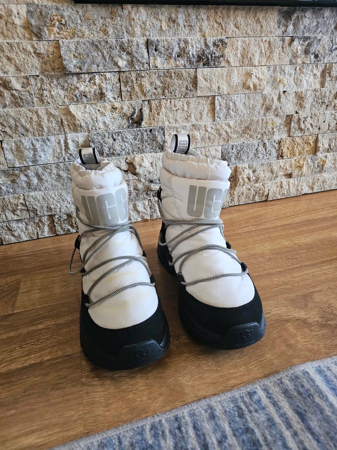 UGG women's Neumel Puffer boots in black and white. Padded shaft with UGG logo detailing and a secure lace-up closure. Durable rubber sole for traction. SIZE 8 feet size 7