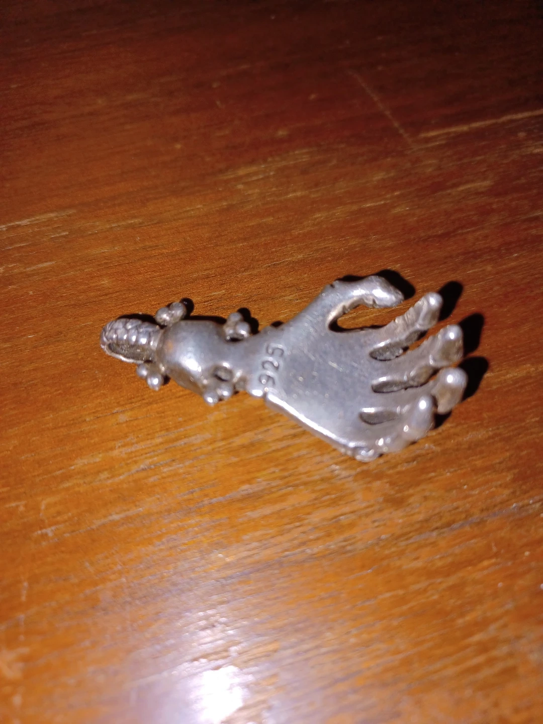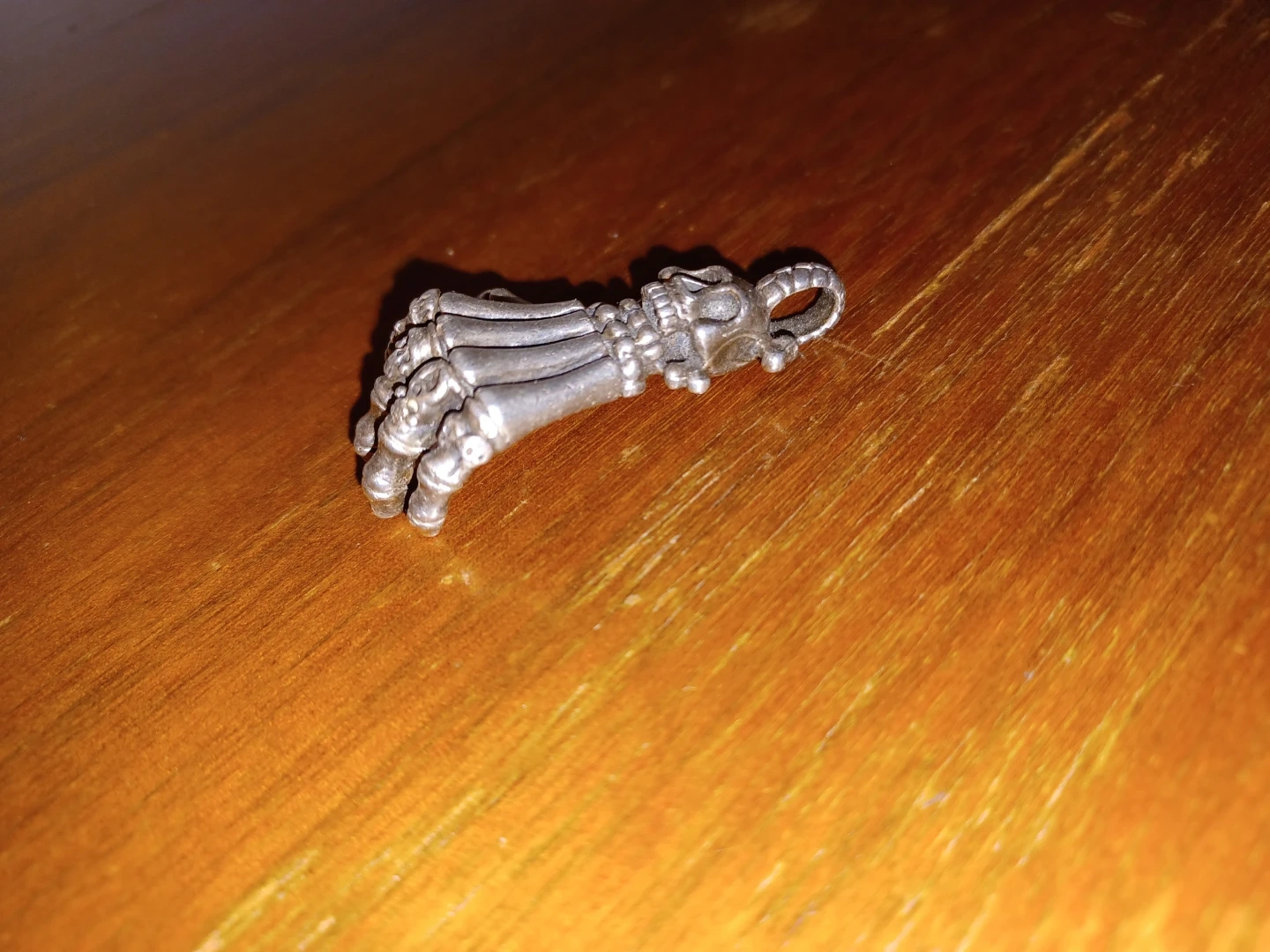 This pendant features a detailed skeleton hand design. It's marked with '925' indicating sterling silver. The intricate detailing includes small skull accents.