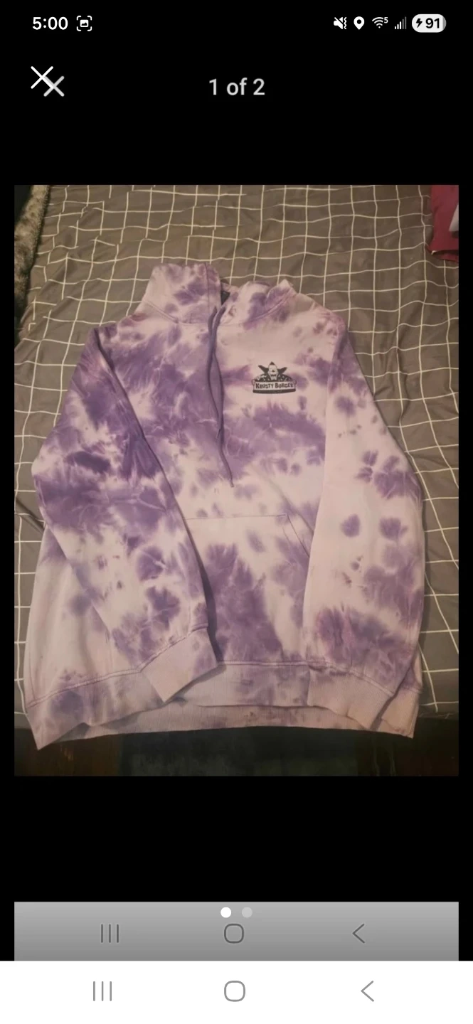 This purple tie-dye hoodie features a Krusty Burger graphic on the back. It's a pullover style with a front pouch pocket. Soft material for comfortable wear.
