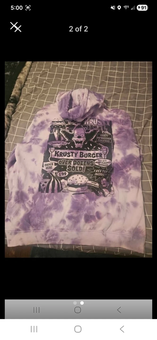 This purple tie-dye hoodie features a Krusty Burger graphic on the back. It's a pullover style with a front pouch pocket. Soft material for comfortable wear.