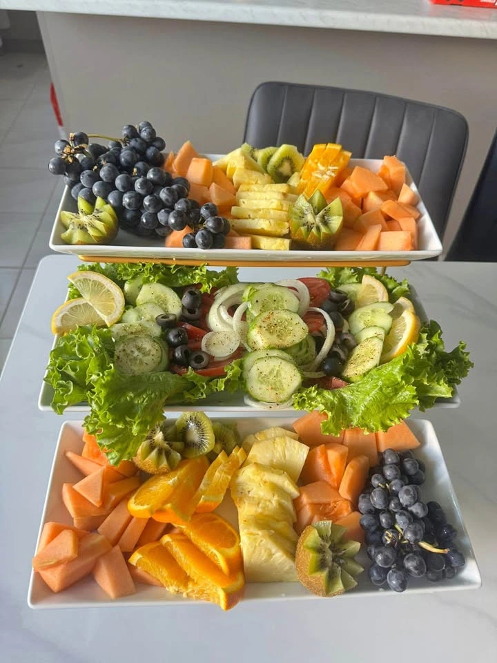 This exquisite used fruit and salad platter features a delightful assortment of fresh, colourful fruits and crisp salad vegetables, perfect for any gathering. The three-tiered arrangement includes juicy grapes, sweet cantaloupe, tangy kiwi, refreshing oranges, and pineapple chunks, complemented by a garden salad with lettuce, cucumbers, tomatoes, onions, and olives. It's a feast for the eyes and a treat for the taste buds! * Fresh Fruits * Garden Salad This platter is priced to sell, reflecting its well-loved condition.