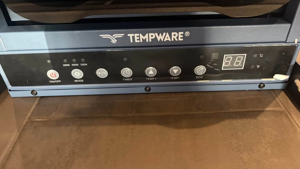 New Tempware ceiling mount digital heater with 5000 watts of power. Features digital controls with timer, temperature settings, and an ECO mode. Remote control included. Hardwired install